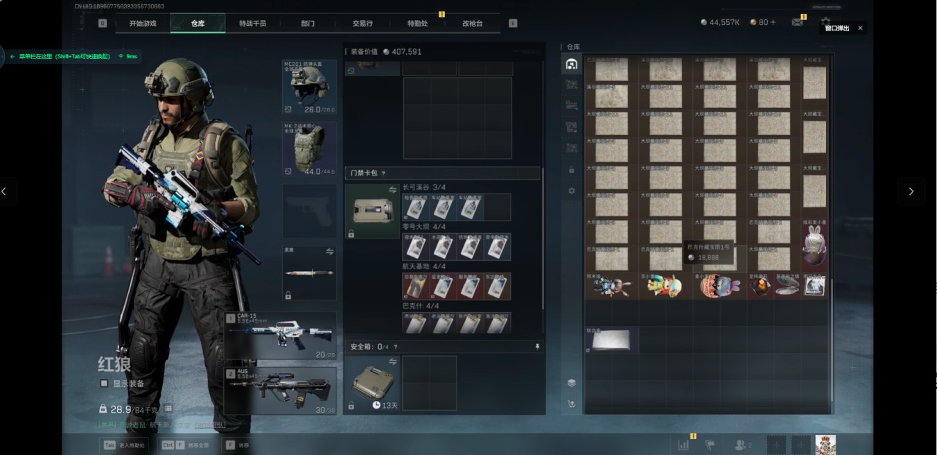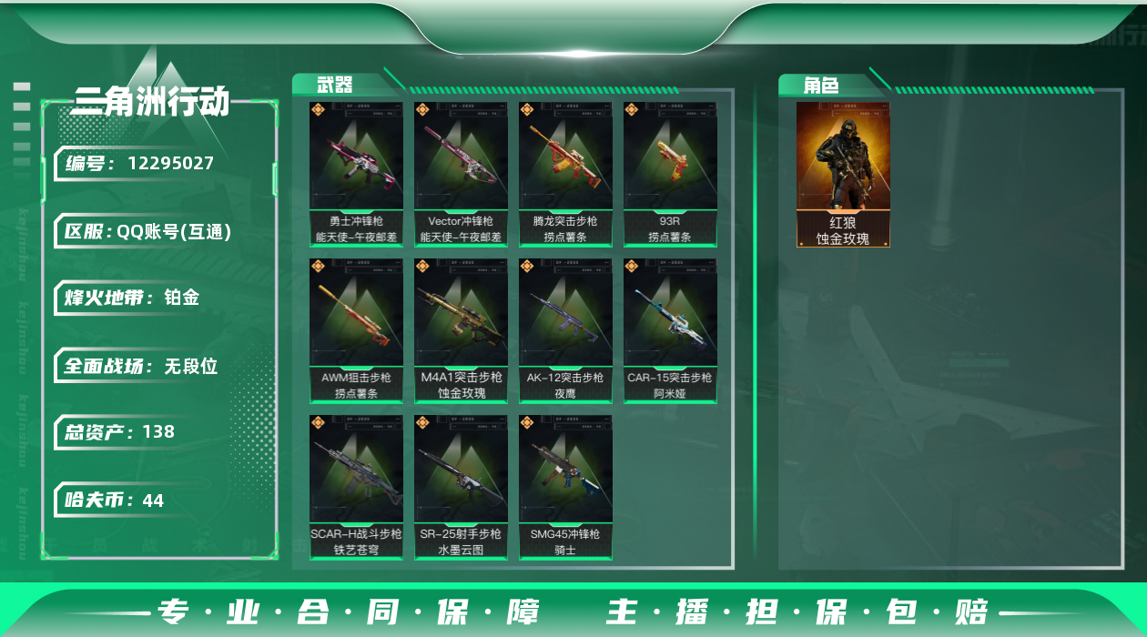 [12295027]总资产:138.5M 1干员外观 11传说枪械 哈夫币:44.557K 可二次 可修改实名 烽火地带段位:铂金 全面战场段位:无段位 传说武器皮肤:SR-25射手步枪-水墨云图,SCAR-H战斗步枪-铁艺苍穹,SMG45冲锋枪-骑士,AWM狙击步枪-捞点薯条,腾龙突击步枪-捞点薯条,93R-捞点薯条,勇士冲锋枪-能天使-午夜邮差,Vector冲锋枪-能天使-午夜邮差,CAR-15突击步枪-阿米娅,AK-12突击步枪-夜鹰,M4A1突击步枪-蚀金玫瑰 干员外观:红狼-蚀金玫瑰
