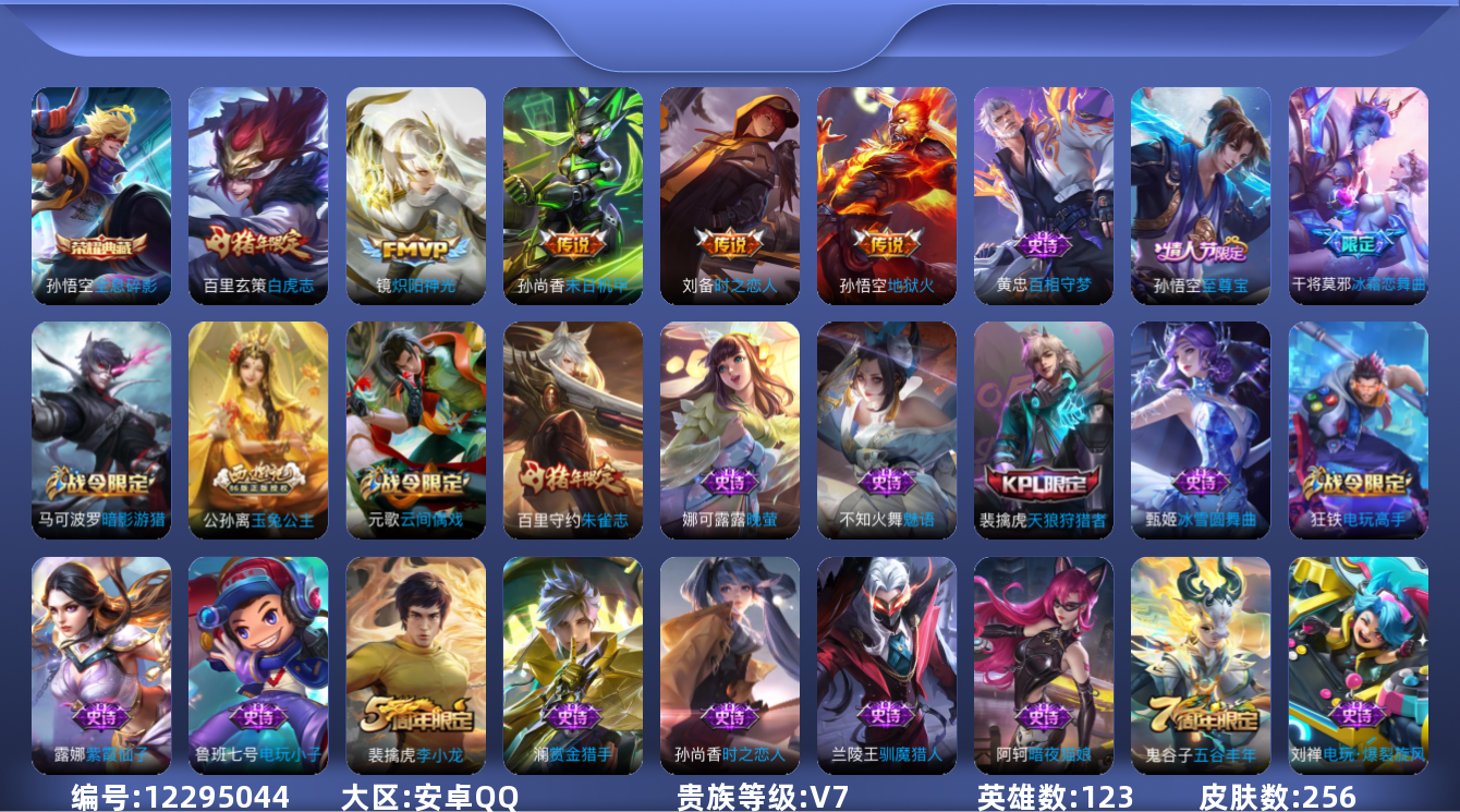 - [11607542]V10 7典藏 4无双 5珍品传说 46传说 125英雄 442皮肤 可修改实名 优质装备:天鹅之梦(小乔典藏),杀手不太冷,鸣剑·曳影,星域神启(倪克斯贼亮),九霄神辉(木兰典藏),弑枪猎影(韩信典藏),碎月剑心(李白无双),花合斗,离恨烟(公孙离无双),器灵·螭龙剑,最初的交响(伽罗典藏),怪盗基德,器灵·落星盏,大耳狗之梦,黑崎一护,黄金白羊座,久胜战神,炽阳神光,一念神魔,云霓雀翎,末日机甲-孙尚香(绿蚂蚱),地狱火,胖达荣荣,李逍遥,时之恋人-刘备(电焊工),超时空战士-狄仁杰,挚爱之约,碎云,神器·狴犴令,山海·炽霜斩(李信年限),山海·琳琅生(小乔年限),山海·苍雷引(电光曜子),画中仙,浮生妄,惊梅引,澜逐花归海,艾琳觅芳踪,千劫归真 珍品传说:时之奇旅-孙策 传说皮:乘龙·问璇玑(孙尚香年限),乘龙·铭钟鼎(赵云年限),乘龙·淬吴钩(孙策年限),吕布曦玄引,云诺千山,铠冥王哈迪斯,续相思,星之鸣奏,幻光神枪 珍宝阁皮:妄想食味,优雅恋人,女武神 限定皮:愿照·九州拓(澜年限),愿照·山河定(司空震年限),愿照·千秋盛(女娲年限),逐霄战戟,鸣野蒿,至尊宝,凤求凰(白切鸡),太华(伽罗年限),傲雪梅枪,前尘镜,绯月行,白晶晶,神威(电光马子),飞衡(韩信年限),玄嵩(庄周年限),山海·碧波行(瑶年限),遇见飞天,高山流水,诗剑行,齐天大圣,五谷丰年,冰锋战神,武圣,梁祝,天狼狩猎者,李小龙,逐梦之影,朱雀志(守约年限),如梦令-后羿,默契交锋-兰陵王,真爱至上,孙行者,猪悟能,一生所爱,大圣娶亲,引擎之心,青春决赛季,冰霜恋舞曲,云端筑梦师,蜜橘之夏,匿光追影者,寅虎·心曲(虎婆),寅虎·赤拳(老虎年限),百木心枪,玉兔公主,山海·玄木吟(马可年限),冰霜神祇 史诗皮:鸭鸭历险记-刘禅,飞车小橘子,器灵·浮梦炉,糖绘人间,绮世丹青,化蝶舞,灵蛊蚀心,星界战将,谪仙醉月,龙之律动,雪豹·霜爪,石田雨龙,百相守梦-周瑜,茶境仙,炽弈燎原,东方月初,埋骨钱,海诺心动手记,上官婉儿群星魔术团,曹操夜都魔契,乘龙·聚宝船(安琪拉年限),乘龙·忆丹青(大乔年限),紫霞仙子,苍穹之光,电玩小子(小书包),黄金分割率,特工魅影,千年之狐,永昼,魅语,蒙恬荣光圣徽,无限星赏官,冰冠公主,偶像歌手,白蛇,晚萤,电玩·爆裂旋风,暗夜猫娘,龙骑士(小龙虾),末日机甲-吕