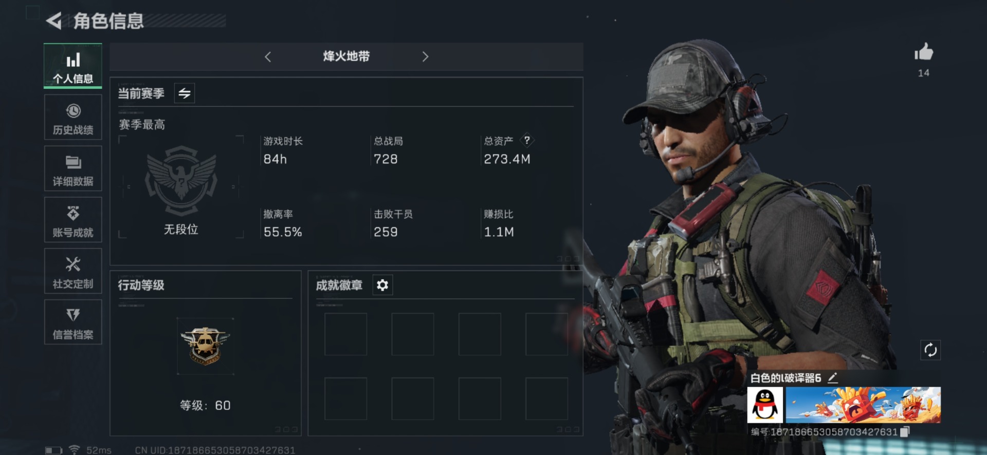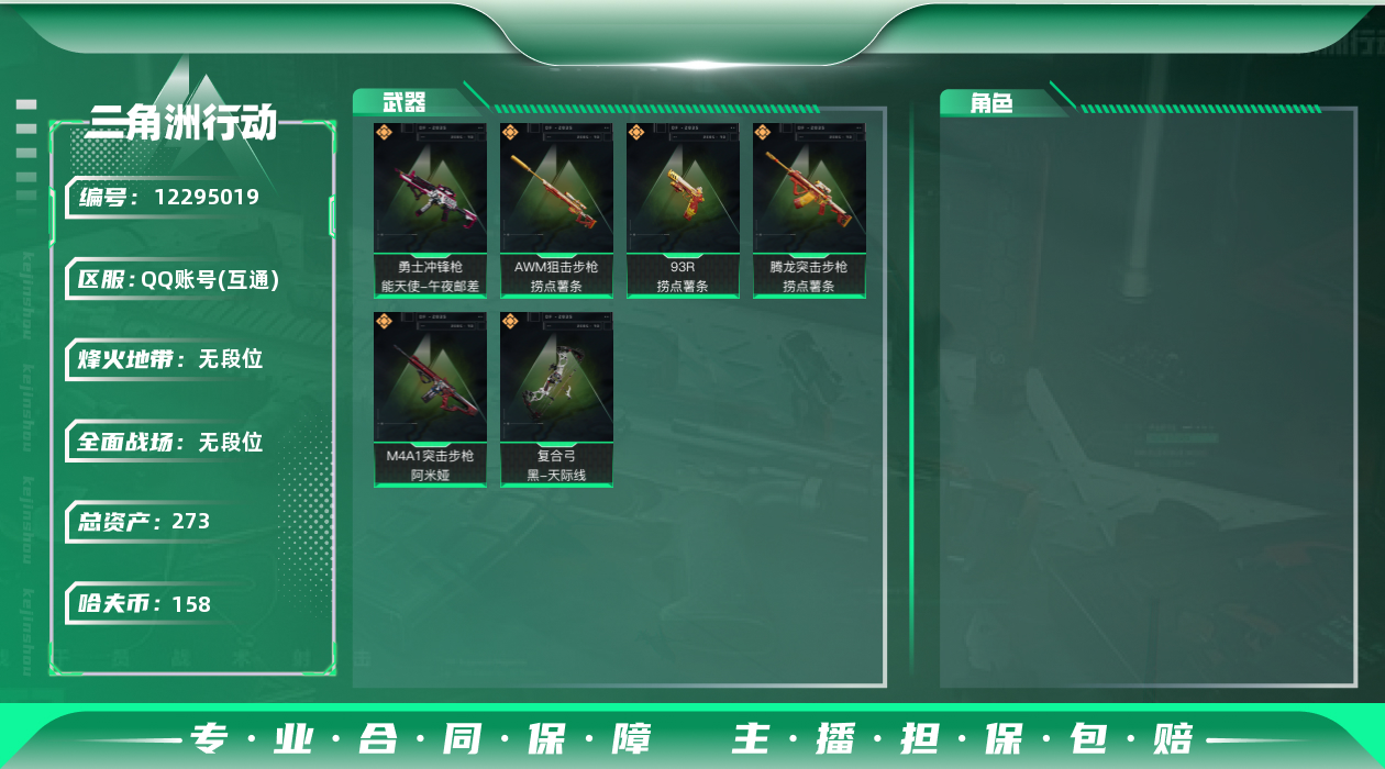[12295019]总资产:273.4M 6传说枪械 哈夫币:158K 进阶安全箱(2×2)9.15号到期 可二次 可修改实名 烽火地带段位:无段位 全面战场段位:无段位 传说武器皮肤:M4A1突击步枪-阿米娅,复合弓-黑-天际线,AWM狙击步枪-捞点薯条,腾龙突击步枪-捞点薯条,93R-捞点薯条,勇士冲锋枪-能天使-午夜邮差