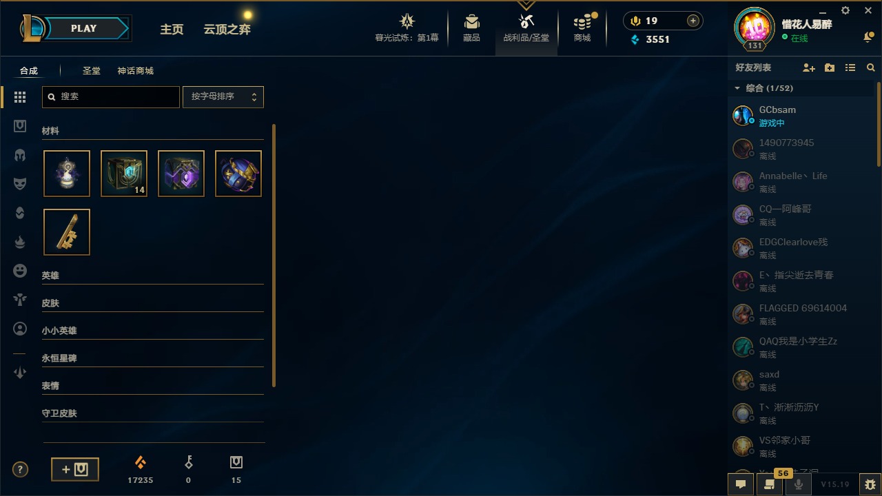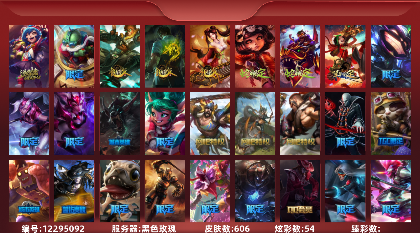 [12295092]1神话 104限定 58传说 157史诗 606皮肤 54炫彩 153英雄 可二次 可修改实名 优质装备:哥特萝莉,防爆天使 凯尔,暗影 沃里克,巧克力工坊 波比,创世纪 希维尔,电玩战魂 人马,都铎王朝 图奇,夺命美人 卡特,防爆士兵 炼金,防爆士兵 格雷福斯,钢铁之翼 凤凰,冠军典狱长 锤石,冠军掠夺者 卡兹克,冠军之血 希瓦娜,红桃杰克 崔斯特,机械迷城 加里奥,惊悚派对 费德提克,警用试作体K-9 内瑟斯,克格汪 克格莫,蓝色忧郁 崔斯特,蒙多蒙多,密林猎手 提莫,诺斯费拉图 弗拉基米尔,野兽猎人 德莱文,野兽猎人 瑟庄妮,野兽猎人 泰达米尔,勇者 阿狸,勇者 奈德丽,战场BOSS 吉格斯,卧虎藏龙 贾克斯,奥德赛 吉格斯,泳池派对 奥莉安娜 优雅珠光鲸,外星装甲 库奇 限定:生化领主 泰达米尔 情人节限定:觅心女王 寒冰,觅心游侠 卢锡安,甜心之羽 霞 冠军限定系列:S1FNC 酒桶,S1FNC 迦娜,S1FNC 嘉文四世,S1FNC 卡尔萨斯,S1FNC 库奇,S2 暗杀星 蒙多,S2 暗杀星 努努,S2 暗杀星 慎,S3 SKT T1 贾克斯,S3 SKT T1 婕拉,S4 SSW 锤石,S4 SSW 泰隆,S4 SSW 图奇,S4 SSW 炼金,S5 SKT T1 阿利斯塔,S5 SKT T1 阿兹尔,S6 SKT T1 奥拉夫,S7 SSG 嘉文四世 冰雪节限定:“主人不要我了” 阿木木,冰雪风暴 希维尔,冰雪节 马尔扎哈,冰雪节 炼金,冰雪女神 辛德拉,冰雪兽 纳尔,冬季仙境 发条,胡桃夹子 小丑,平安夜女神 娑娜,魄罗骑士 瑟庄妮,圣诞精灵 崔丝塔娜,圣诞狂欢 时光,圣诞狂欢 努努,圣诞老人 布隆,圣诞老人 酒桶,圣诞糖果棒 厄运小姐,圣诞玩偶 波比,圣诞驯鹿 克格莫,冰雪节 茂凯,邪恶圣诞老人 维迦,幸福女神 乐芙兰,雪默丁格,雪装 奈德丽,英勇玩具兵船长 泳池派对:泳池派对 吉格斯,泳池派对 发条,泳池派对 男枪,泳池派对 菲奥娜,泳池派对 黑默丁格,泳池派对 凯特琳,泳池派对 李青,泳池派对 塔里克,泳池派对 塔利亚 万圣节限定:鬼影森森 茂凯,鬼影重重 魔腾,海贼 瑞兹,魅惑女巫 奈德丽,南瓜头 费德提克,死亡誓约 卡特琳娜,无头骑士 人马 年限:龙年 孙悟空,龙年 李青,龙年 娑娜,蛇年 安妮,蛇年 库奇,羊年 金克丝 周年:1周年