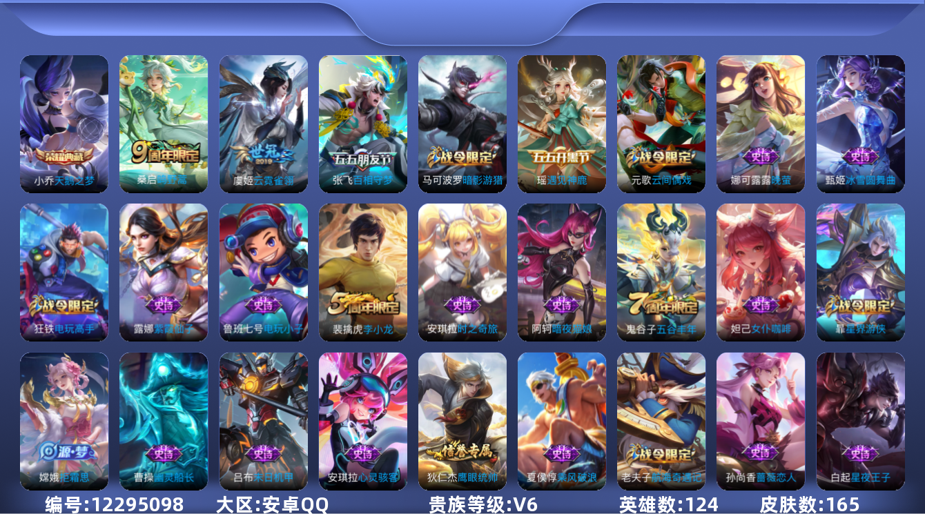 - [11445407]V9 2典藏 1无双 1珍品传说 23传说 125英雄 324皮肤 可修改实名 女号 荣耀水晶:最初的交响(伽罗典藏),鸣剑·曳影 无双皮:小乔时之魔女(小乔无双) 珍品传说:怪盗基德 传说皮:乘龙·问璇玑(孙尚香年限),乘龙·铭钟鼎(赵云年限),乘龙·淬吴钩(孙策年限),续相思,李逍遥,游龙清影(小青龙),山海·炽霜斩(李信年限),山海·琳琅生(小乔年限),仲夏夜之梦(大飞蛾),云霓雀翎,一念神魔,云鹰飞将(小将军),炽阳神光,胖达荣荣,乞巧织情,山海·苍雷引(电光曜子),鹤羽星尊 珍宝阁皮:女武神 限定皮:愿照·九州拓(澜年限),逐霄战戟,凤求凰(白切鸡),凤凰于飞,绯月行,时雨天司(水龙头),飞衡(韩信年限),山海·碧波行(瑶年限),遇见飞天,高山流水,游园惊梦,梁祝,烈魂,虎魄,祈雪灵祝(雪兔子),李小龙,朱雀志(守约年限),孙行者,青春决赛季,神奇女侠,寅虎·心曲(虎婆),山海·玄木吟(马可年限) 史诗皮:百相守梦-百里守约,星界战将,茶境仙,器灵·浮梦炉,化蝶舞,龙之律动,乘龙·聚宝船(安琪拉年限),乘龙·忆丹青(大乔年限),百相守梦-周瑜,紫霞仙子,电玩小子(小书包),白龙吟,黄金分割率,千年之狐,永昼,电玩·爆裂旋风,匿光破解者,冰冠公主,百解令(蒙犽),蒙恬荣光圣徽,偶像歌手,银翎春语,晚萤,暗夜猫娘,无限星赏官,魅语,龙骑士(小龙虾),猫狗日记-大乔,时之恋人-孙尚香,乱世虎臣,修罗,女仆咖啡,水果甜心,星夜王子,心灵骇客,功夫厨神,德古拉伯爵,暗隐猎兽者,幽灵船长,鬼剑武藏,心灵战警,舞动绿茵,诗语江南,繁星吟游(呼啦呼啦),拒霜思,缤纷独角兽,乘风破浪,逐浪之夏,水晶猎龙者,热力回旋,箭羽风息,金属风暴,原初追逐者,圣诞狂欢,圣诞恋歌,鹰眼统帅,黎明之约,赏金猎手,奇遇舞章,滕王阁序,顽趣-阿古朵