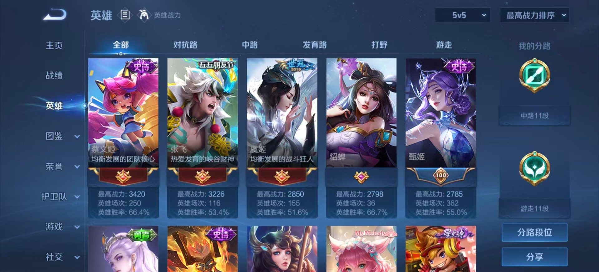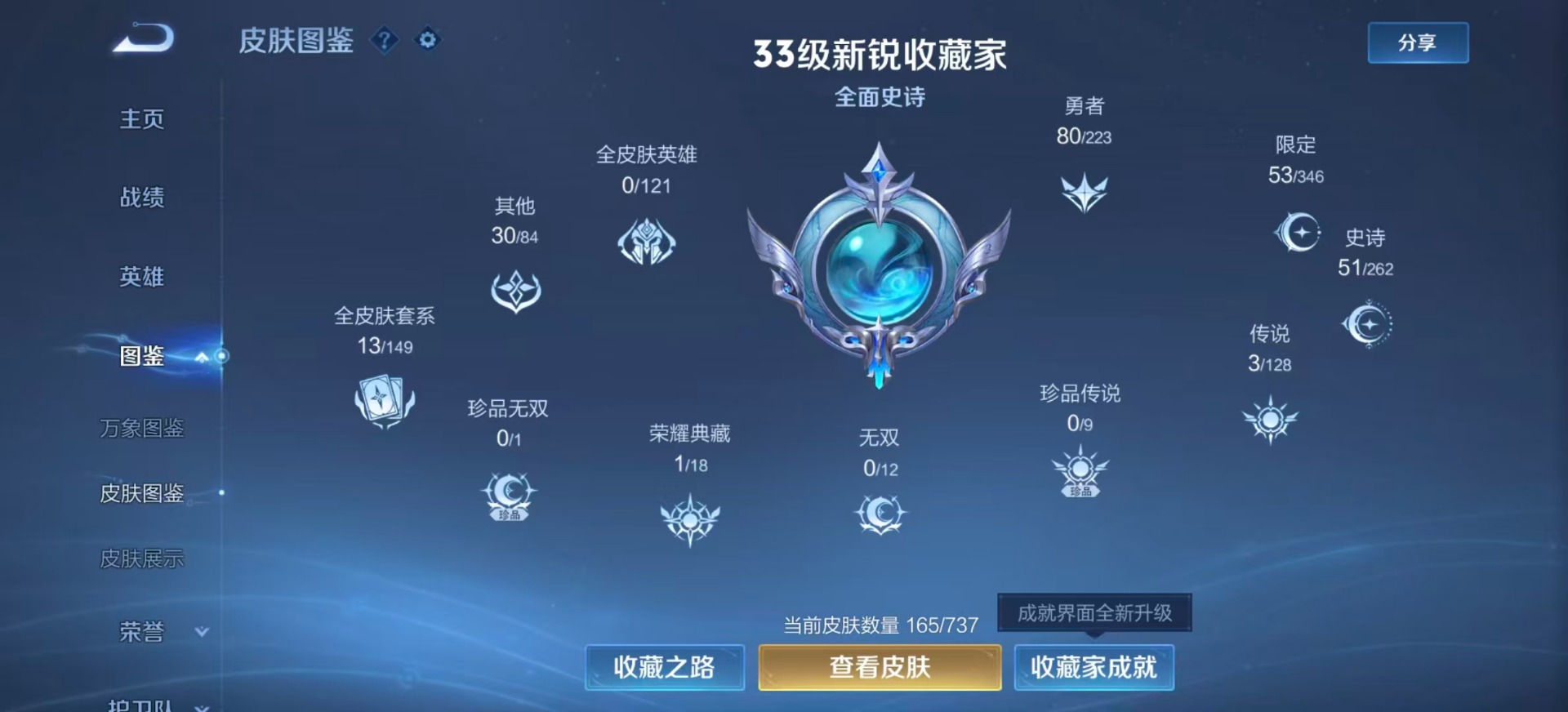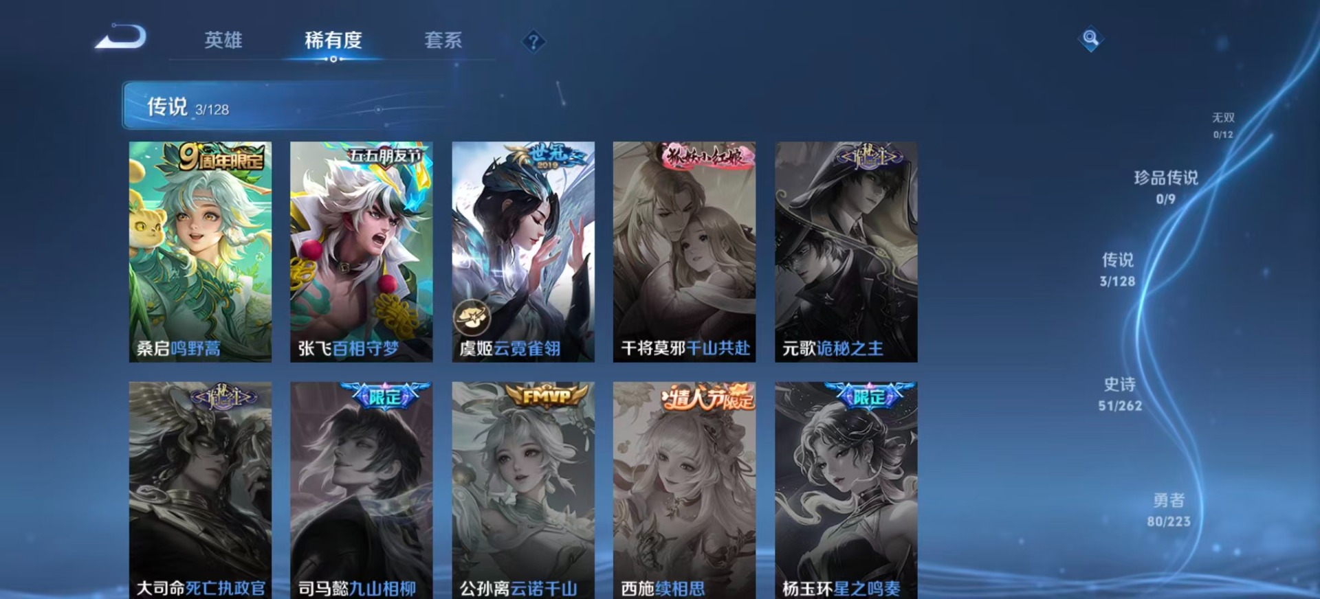 - PX_2096917-贵族等级: V8 英雄数: 123 皮肤数: 280 荣耀水晶: 弑枪猎影 星传说: 幽冥之眼,玉鸾吟 传说皮: 黄金狮子座,冠军飞将,云鹰飞将,绛天战甲,炽阳神光,一念神魔,末日机甲-孙尚香,零号·赤焰,地狱之眼,李逍遥,超时空战士-狄仁杰,无双飞将,碎云,遇见神鼓,澜逐花归海 限定皮: 遇见飞天,李小龙,神威,时之彼端,逐梦之影,至尊宝,大圣娶亲,高山流水,猪悟能,诗剑行