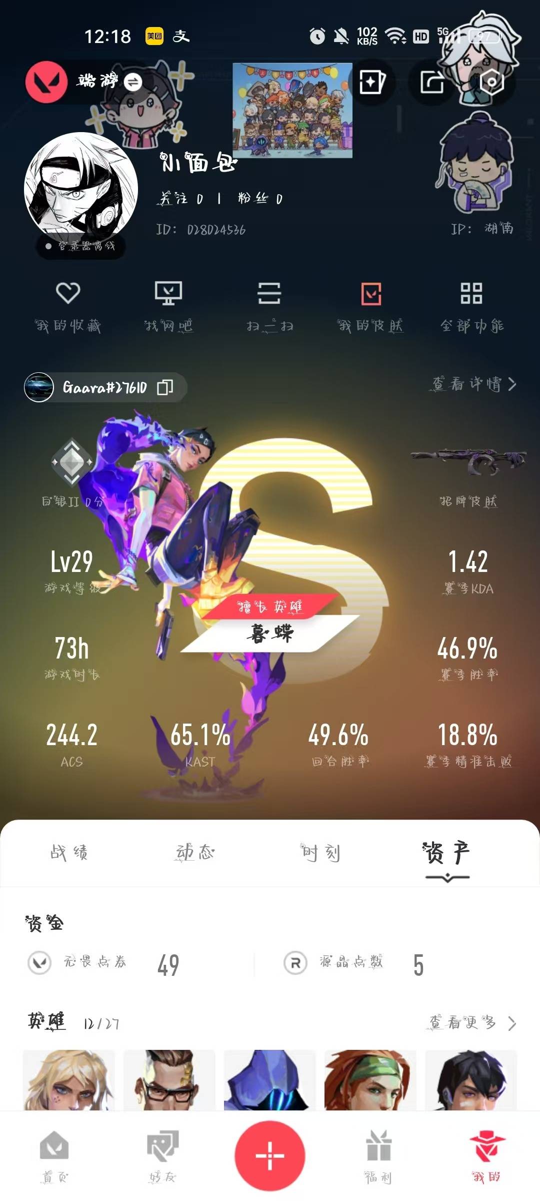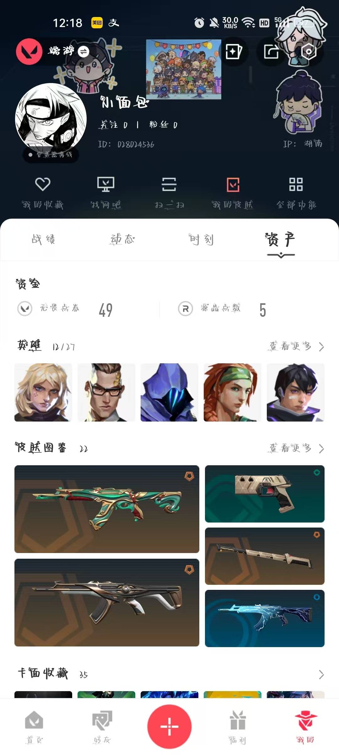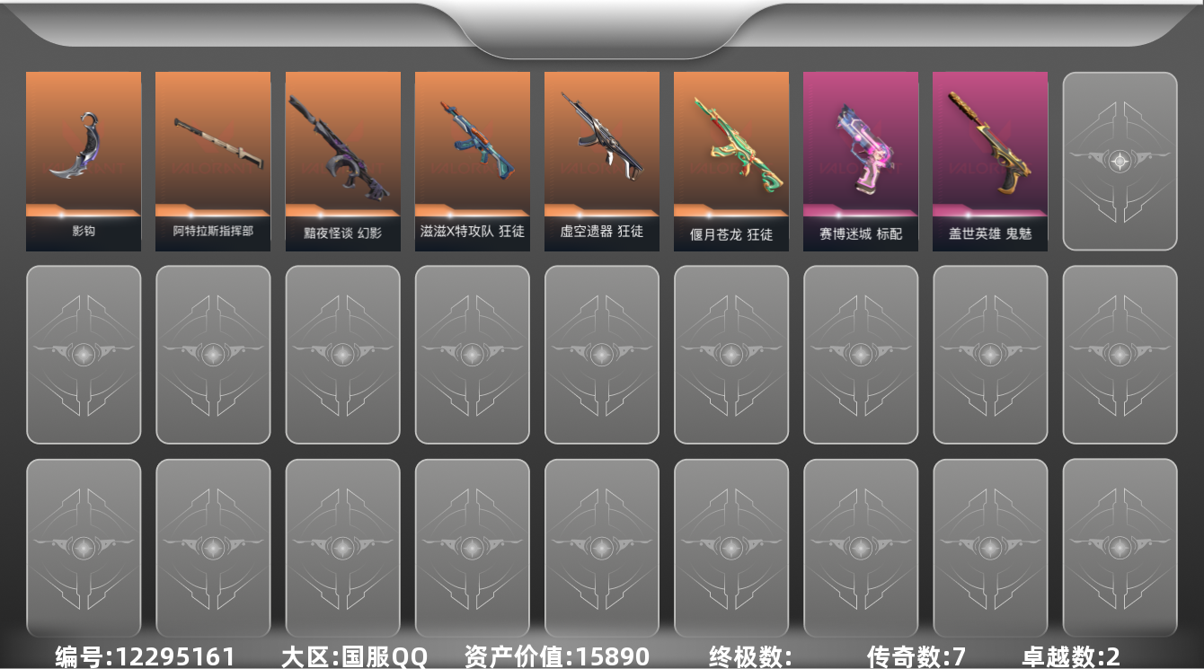 [12295161]7橙皮 2紫皮 22皮肤 12英雄 35卡面 275已用源晶 白银 优质装备:狂徒-偃月苍龙,幻影-黯夜怪谈,鬼魅-盖世英雄,阿特拉斯指挥部,影钩 佩枪皮肤:标配-赛博迷城 步枪皮肤:狂徒-虚空遗器,狂徒-滋滋X特攻队