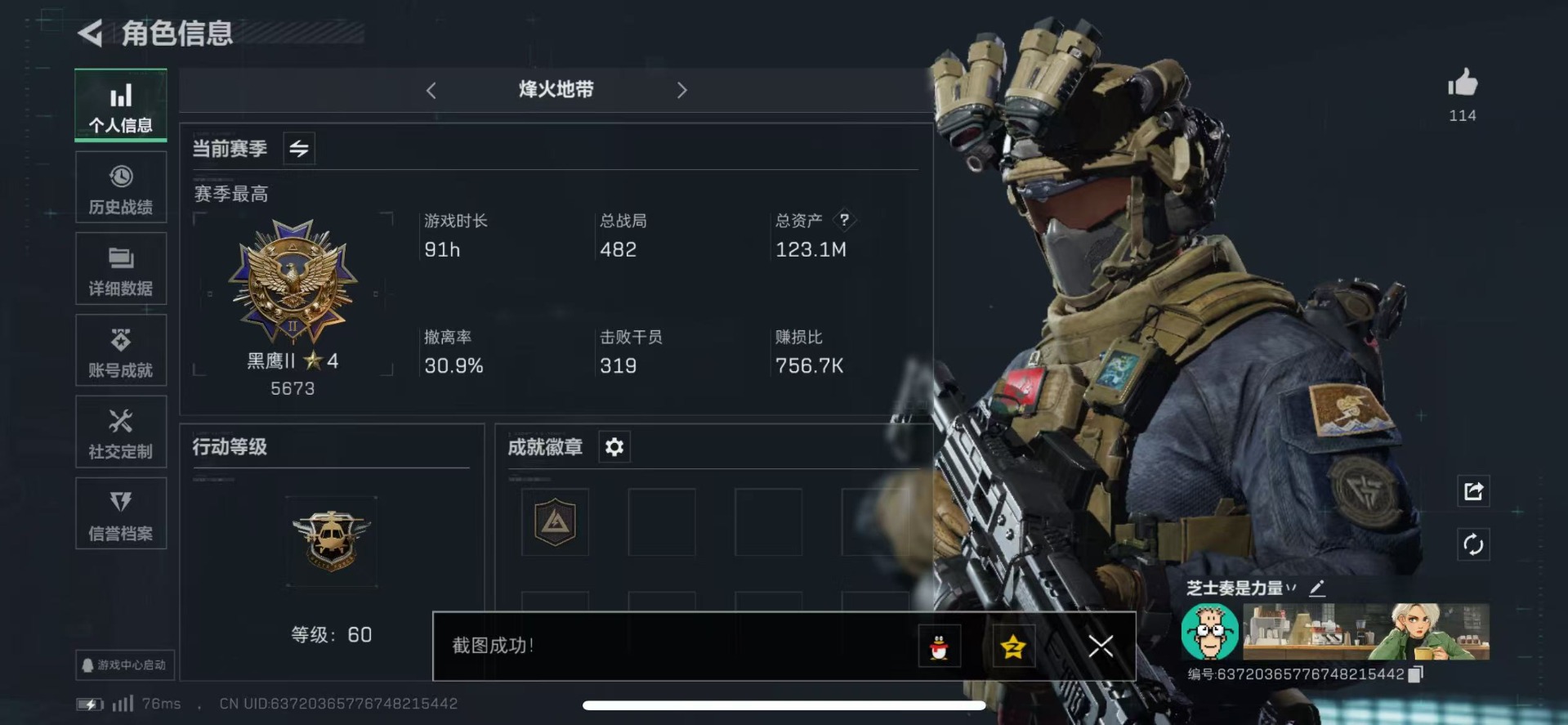 - [12085795]总资产:184.8 2干员外观 3传说枪械 顶级安全箱(3×3)9.15号到期 可二次 可修改实名 烽火地带段位:钻石 全面战场段位:无段位 哈夫币:35.206 传说武器皮肤:AK-12突击步枪-夜鹰,复合弓-黑-天际线,725双管霰弹枪-送葬人-无题密令 史诗武器皮肤:SR-25射手步枪-尖端治疗,PKM通用机枪-荒野求生,AS Val突击步枪-尖端治疗,M700狙击步枪-守夜人,SG552突击步枪-尖端治疗,Ash-12战斗步枪-守夜人,MP5冲锋枪-深海恐惧,SR-3M紧凑突击步枪-荒野求生,AKM突击步枪-林中猎手,M16A4突击步枪-竞赛选手,PKM通用机枪-守夜人,SVD狙击步枪-荒野求生,M1014霰弹枪-林中猎手,SV-98狙击步枪-林中猎手,PTR-32突击步枪-英雄,PSG-1射手步枪-无垢,AS Val突击步枪-典狱官,SV-98狙击步枪-囚徒,腾龙突击步枪-无垢,MP7冲锋枪-无垢,SVD狙击步枪-阿萨拉工艺 干员外观:无名-夜鹰,蜂医-送葬人·无题密令(S5)