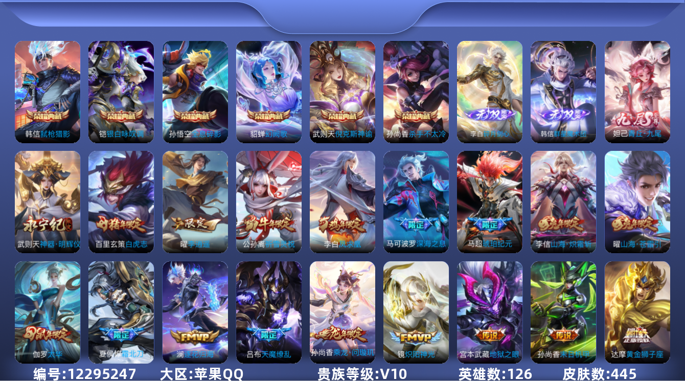 - [11877367]V8 2典藏 21传说 123英雄 293皮肤 可修改实名 优质装备:鸣剑·曳影,全息碎影(猴子典藏),黄金射手座,云鹰飞将(小将军),炽阳神光,一念神魔,末日机甲-孙尚香(绿蚂蚱),地狱火,零号·赤焰,地狱之眼,李逍遥,淬星耀世,超时空战士-狄仁杰,末日机甲-孙策,无双飞将,记忆之芯(机甲兔) 珍宝阁皮:万物之道,优雅恋人,蔷薇恋人 限定皮:至尊宝,白虎志(电光耗子),异界灵契(白毛香),绯月行,时雨天司(水龙头),遇见飞天,高山流水,齐天大圣,五谷丰年,冰锋战神,游园惊梦,梁祝,天狼狩猎者,逐梦之星,逐梦之音,李小龙,逐梦之影,朱雀志(守约年限),永曜之星,霸王别姬-项羽,默契交锋-花木兰,猪悟能,大圣娶亲,蜜橘之夏,匿光追影者 史诗皮:紫霞仙子,电玩小子(小书包),白龙吟,黄金分割率,特工魅影,千年之狐,永昼,高渐离燃音魔法,偶像歌手,龙骑士(小龙虾),暗夜猫娘,魅语,冰冠公主,末日机甲-吕布,时之恋人-孙尚香,乱世虎臣,节奏热浪,修罗,女仆咖啡,摇滚巨星,水果甜心,绅士熊喵,天才门将,星夜王子,心灵骇客,功夫厨神,德古拉伯爵,暗隐猎兽者,幽灵船长,鬼剑武藏,心灵战警,舞动绿茵,地狱岩魂,拒霜思,缤纷独角兽,乘风破浪,逐浪之夏,水晶猎龙者,热力回旋,箭羽风息,金属风暴,原初追逐者,圣诞狂欢,圣诞恋歌,鹰眼统帅,魅力维加斯,黎明之约,赏金猎手,未来纪元-赵云