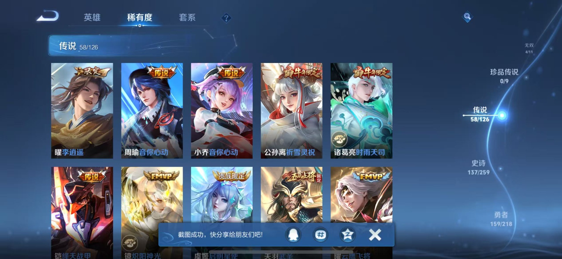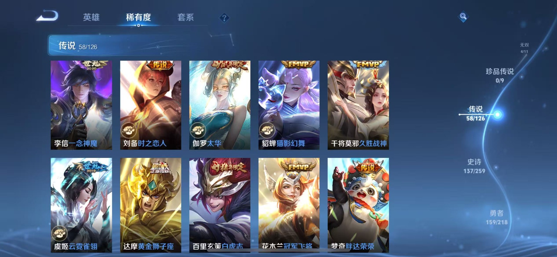 夏侯惇霜北刀,黄忠烈魂,伽罗太华,干将莫邪冰霜恋舞曲,小乔纯白花嫁,孙尚香异界灵契,不知火舞绯月行,鲁班七号乒乒小将,鲁班七号寅虎·瑞焰,露娜启示之音,露娜一生所爱,庄周云端筑梦师,诸葛亮时雨天司,杨玉环寅虎·心曲,公孙离祈雪灵祝,貂蝉逐梦之音,裴擒虎李小龙,上官婉儿梁祝,上官婉儿天狼绘梦者,李白诗剑行,花木兰青春决赛季,马可波罗山海·玄木吟,马可波罗深海之息,西施至美·乘鲤谣,桑启鸣野蒿,孙悟空孙行者,芈月白晶晶,孙悟空至尊宝,百里玄策白虎志,马超神威,韩信飞衡,百里守约朱雀志,王昭君星穹之声,关羽武圣,关羽冰锋战神