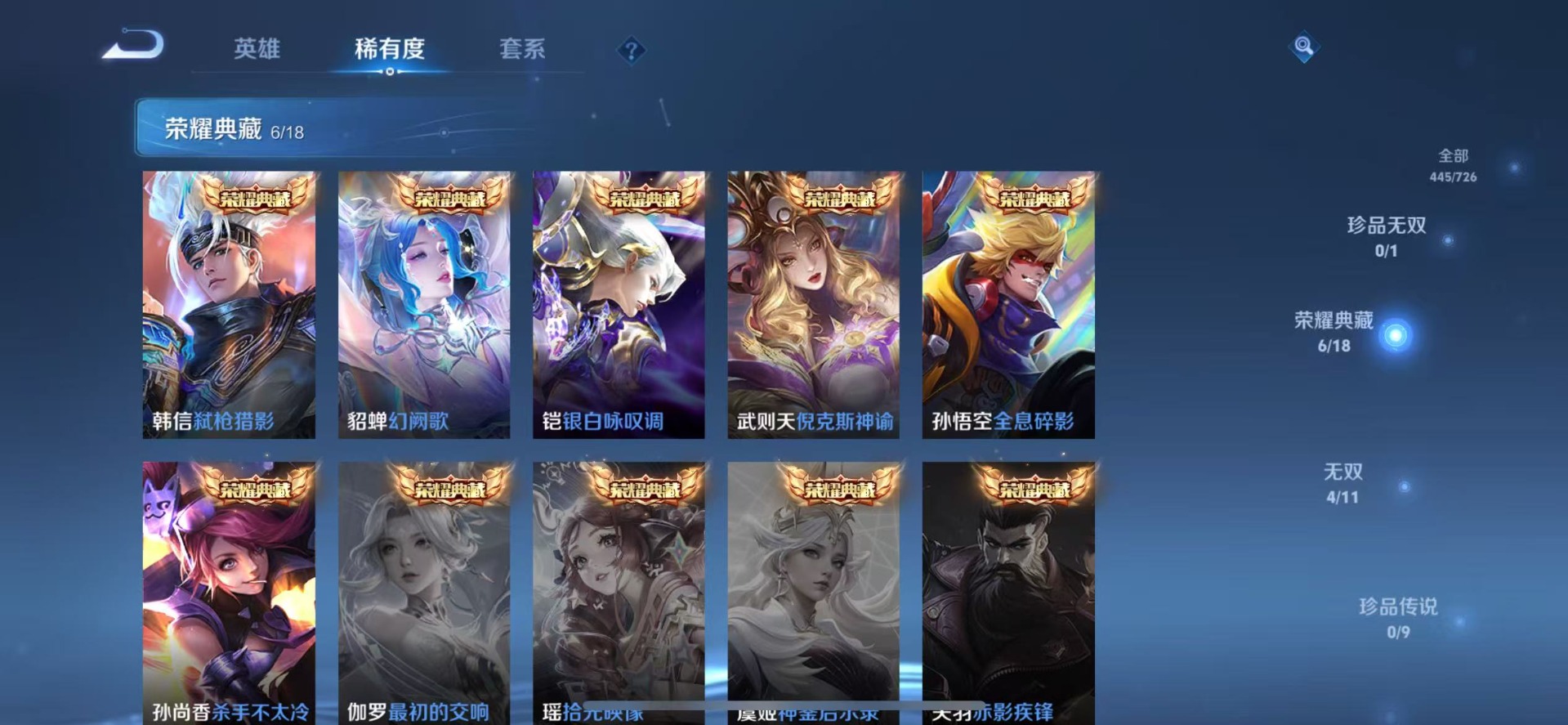 大乔白蛇,大乔猫狗日记,高渐离燃音魔法,海诺心动手记,刘邦德古拉伯爵,夏侯惇乘风破浪,阿轲暗夜猫娘,阿轲节奏热浪,哪吒雪上飞焰,铠曙光守护者,曹操幽灵船长,伽罗箭羽风息,廉颇地狱岩魂,伽罗琥珀纪元,小乔缤纷独角兽,小乔青蛇,孙尚香时之恋人,孙策猫狗日记,不知火舞魅语,海月浮梦罗烟,鲁班七号电玩小子,项羽苍穹之光,吕布圣诞狂欢,吕布末日机甲,露娜紫霞仙子,镜玫瑰异探,镜真我赫兹,周瑜雪夜绮愿,诸葛亮黄金分割率,刘禅电玩·爆裂旋风,司马懿暗渊魔法,刘禅天才门将,刘禅绅士熊喵,宫本武藏鬼剑武藏,公孙离无限星赏官,兰陵王暗隐猎兽者,貂蝉圣诞恋歌,貂蝉唤灵魅影,花木兰水晶猎龙者,夏洛特永昼,李白千年之狐,蒙犽龙鼓争鸣,安琪拉心灵骇客,安琪拉时之奇旅,蒙犽百解令,艾琳奇遇舞章,杨戬天秀·启明,西施诗语江南,白起星夜王子,亚瑟心灵战警,嬴政摇滚巨星,嬴政暗夜贵公子,程咬金功夫厨神,百里玄策热力回旋,百里玄策原初追逐者,雅典娜冰冠公主,雅典娜黎明之约,韩信白龙吟,百里守约真我赫兹,李元芳逐浪之夏,百里守约特工魅影,墨子龙骑士,墨子金属风暴,蔡文姬舞动绿茵,瑶遇见神鹿,澜赏金猎手,娜可露露晚萤,王昭君偶像歌手,嫦娥拒霜思,钟馗乐园奇幻夜,橘右京修罗