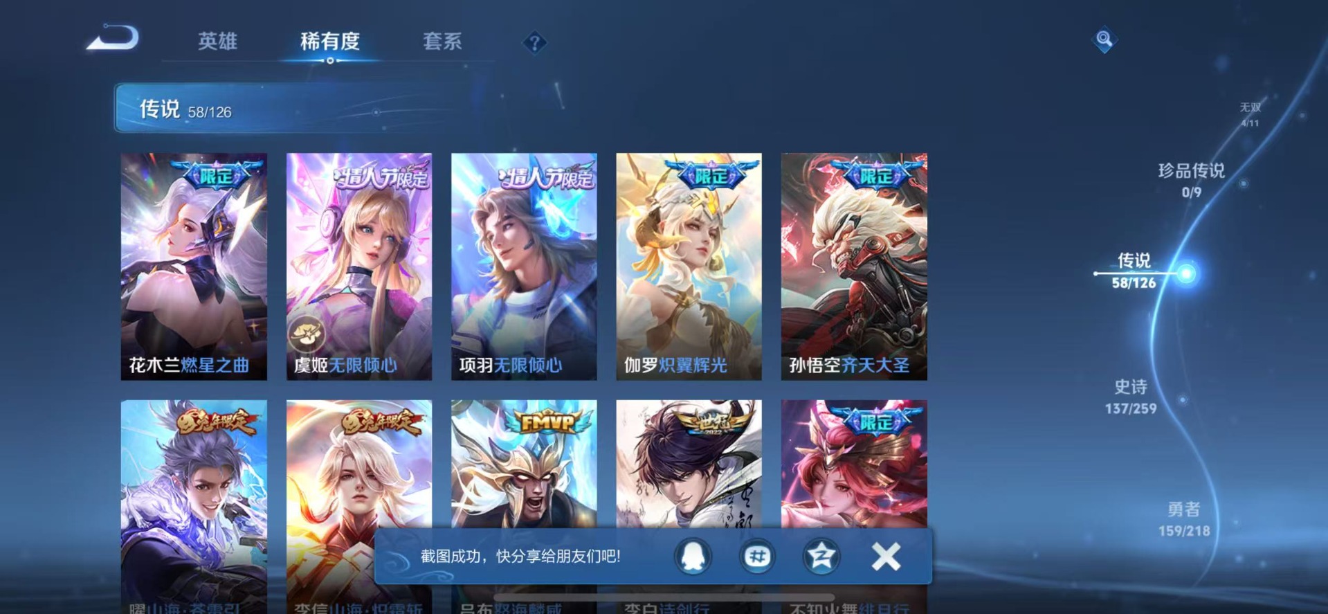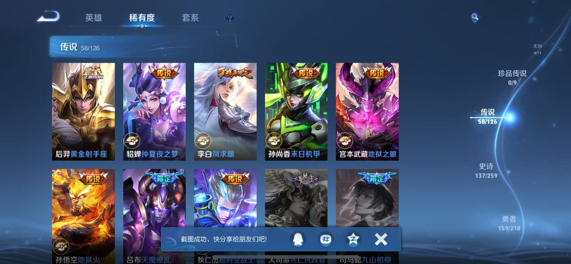 - [11630225]V8 2典藏 2珍品传说 11传说 125英雄 318皮肤 可修改实名 优质装备:鸣剑·曳影,星域神启(倪克斯贼亮),朽木白哉,猫影幻舞,炽阳神光,地狱火,海洋之心,淬星耀世,碎云,山海·苍雷引(电光曜子) 珍品传说:兔狲·蓬尾 传说皮:幻光神枪 珍宝阁皮:万物之道,优雅恋人,蔷薇恋人 限定皮:愿照·九州拓(澜年限),遇见飞天,高山流水,怒海麟威,五谷丰年,青龙志(铠年限),天狼运算者,李小龙,如梦令-后羿,孙行者,引擎之心,百木心枪,山海·玄木吟(马可年限) 史诗皮:鸭鸭历险记-刘禅,器灵·浮梦炉,糖绘人间,绮世丹青,化蝶舞,星界战将,龙之律动,藏狐·褐绒,小牛鸭,石田雨龙,茶境仙,怒海争锋,蒙犽顽岩魄,蔬乡物语(鲁班七号),紫霞仙子,苍穹之光,电玩小子(小书包),黄金分割率,特工魅影,永昼,浮梦罗烟,魅语,高渐离燃音魔法,蒙恬荣光圣徽,匿光破解者,青蛇,偶像歌手,白蛇,晚萤,暗夜猫娘,龙骑士(小龙虾),末日机甲-吕布,猫狗日记-孙策,猫狗日记-大乔,乱世虎臣,节奏热浪,女仆咖啡,摇滚巨星,水果甜心,绅士熊喵,天才门将,星夜王子,心灵骇客,时之奇旅-安琪拉,功夫厨神,德古拉伯爵,暗隐猎兽者,幽灵船长,鬼剑武藏,暗渊魔法,心灵战警,乐园奇幻夜,舞动绿茵,地狱岩魂,纤云弄巧,繁星吟游(呼啦呼啦),拒霜思,缤纷独角兽,乘风破浪,逐浪之夏,月团寄思,水晶猎龙者,曙光守护者,热力回旋,箭羽风息,金属风暴,原初追逐者,圣诞狂欢,圣诞恋歌,鹰眼统帅,暗夜贵公子,魅力维加斯,黎明之约,奇遇舞章,未来纪元-赵云