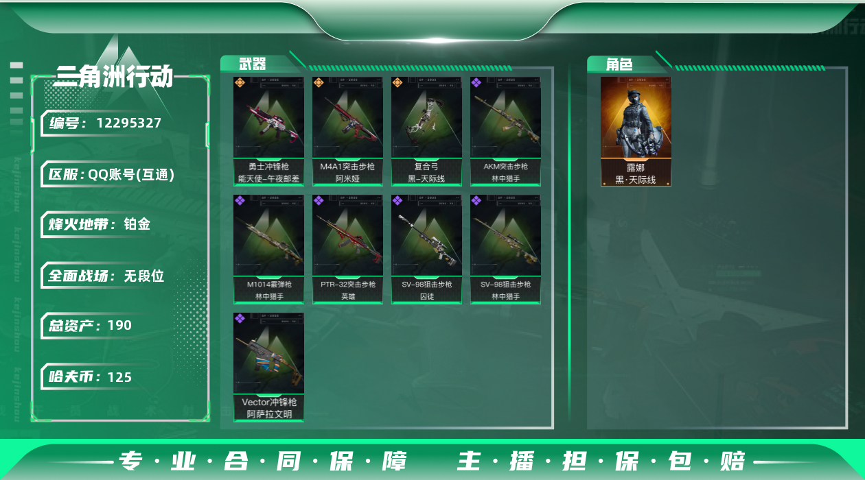 [12295327]总资产:190.2M 1干员外观 3传说枪械 哈夫币:125K 进阶安全箱(2×2)9.15号到期 可二次 可修改实名 烽火地带段位:铂金 全面战场段位:无段位 传说武器皮肤:M4A1突击步枪-阿米娅,复合弓-黑-天际线,勇士冲锋枪-能天使-午夜邮差 史诗武器皮肤:AKM突击步枪-林中猎手,M1014霰弹枪-林中猎手,SV-98狙击步枪-林中猎手,PTR-32突击步枪-英雄,SV-98狙击步枪-囚徒,Vector冲锋枪-阿萨拉文明 干员外观:露娜-黑·天际线
