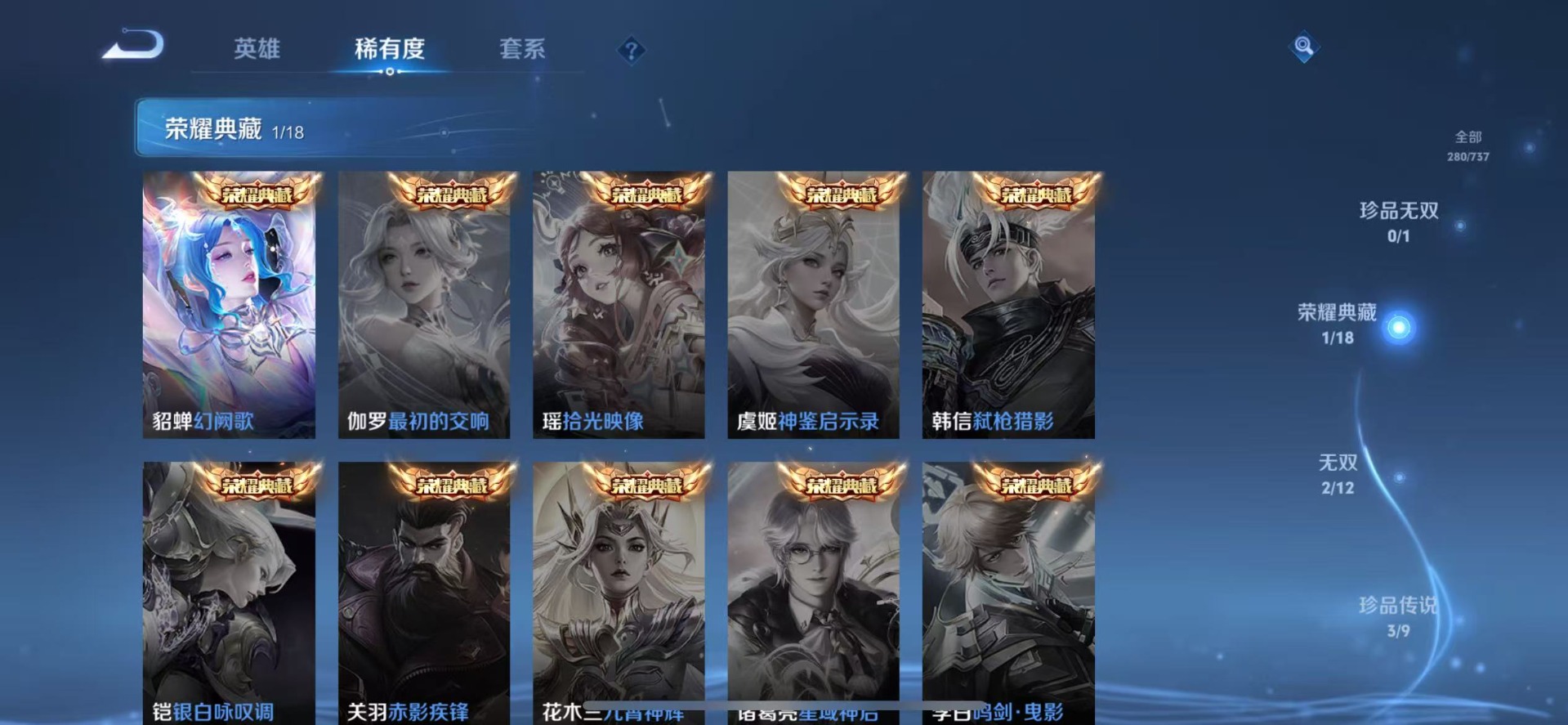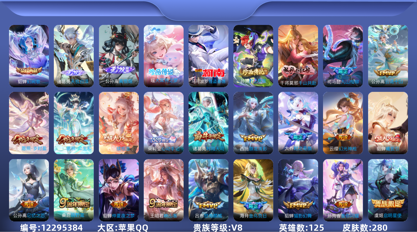 [12295384]V8 1典藏 2无双 3珍品传说 22传说 125英雄 280皮肤 可修改实名 优质装备:幻阙歌(貂蝉典藏),离恨烟(公孙离无双),天机白泽,怪盗基德,大耳狗之梦,猫影幻舞,仲夏夜之梦(大飞蛾),游龙清影(小青龙),音你闪耀(rap皮),记忆之芯(机甲兔),大乔-时之奇旅,金乌负日,朵莉亚心动手记,牧神诗旅,千山共赴,涂山容容 珍品传说:时之奇旅-孙策 传说皮:貂蝉曦玄引,幻光神枪,续相思,云诺千山,九山相柳 珍宝阁皮:妄想食味 限定皮:愿照·岁时盈(虞姬年限),愿照·众生和(妲己年限),逐霄战戟,映山客,陌上桑,鸣野蒿,时之彼端,白鹤梁神女,魔法小厨娘,时雨天司(水龙头),至美·乘鲤谣,怒海麟威,五谷丰年,梁祝,逐梦之音,辉光之辰,蜜橘之夏 史诗皮:化蝶舞,鸭鸭历险记-刘禅,茶境仙,百相守梦-周瑜,幻珠鲛人,飞车小橘子,蒙犽顽岩魄,百相守梦-百里守约,星界特工,炽弈燎原,破空之剑,战舞者,涂山红红,东方月初,埋骨钱,芈月浮光幕影,海诺心动手记,夜落电台,上官婉儿群星魔术团,奇遇星旅,蔬乡物语(鲁班七号),百相守梦-黄忠,织梦人,遇见神鹿,紫霞仙子,特工魅影,永昼,白蛇,江河有灵,百解令(蒙犽),高渐离燃音魔法,晚萤,魅语,无限星赏官,冰冠公主,青蛇,浮梦罗烟,电玩·爆裂旋风,银翎春语,暗夜猫娘,猫狗日记-大乔,乱世虎臣,节奏热浪,女仆咖啡,摇滚巨星,水果甜心,星夜王子,心灵骇客,时之奇旅-安琪拉,德古拉伯爵,暗隐猎兽者,鬼剑武藏,心灵战警,舞动绿茵,诗语江南,纤云弄巧,拒霜思,缤纷独角兽,逐浪之夏,水晶猎龙者,箭羽风息,唤灵魅影,金属风暴,圣诞恋歌,魅力维加斯,未来纪元-赵云