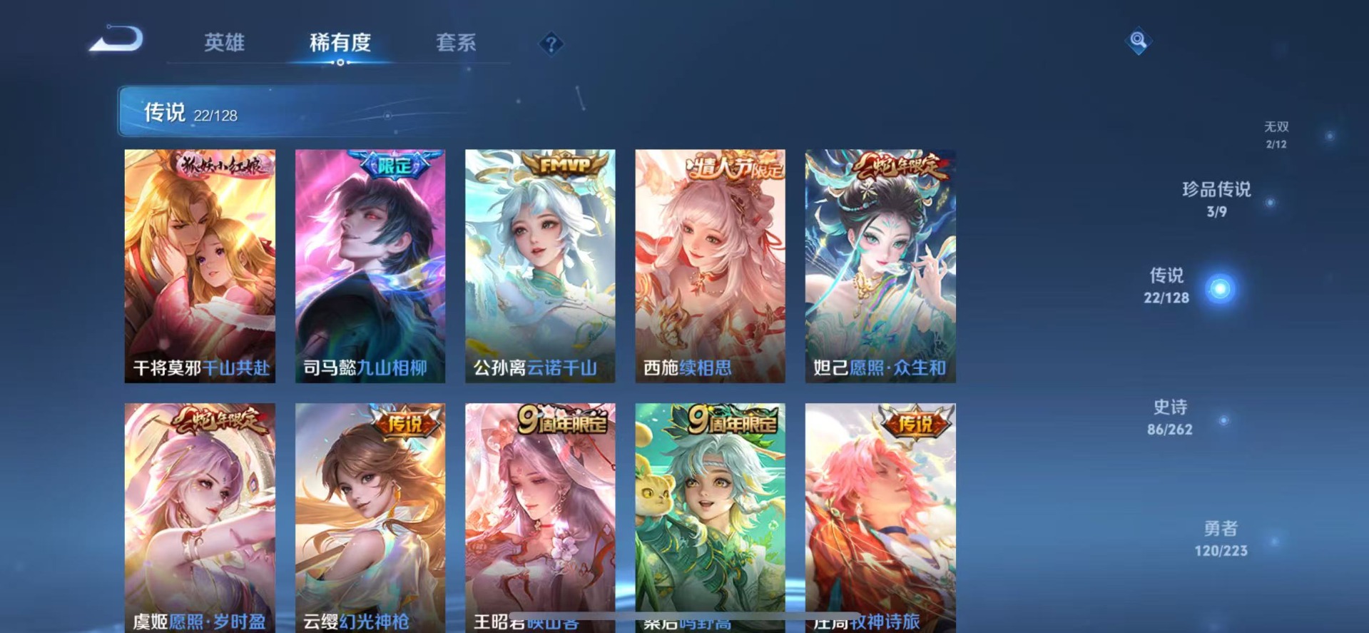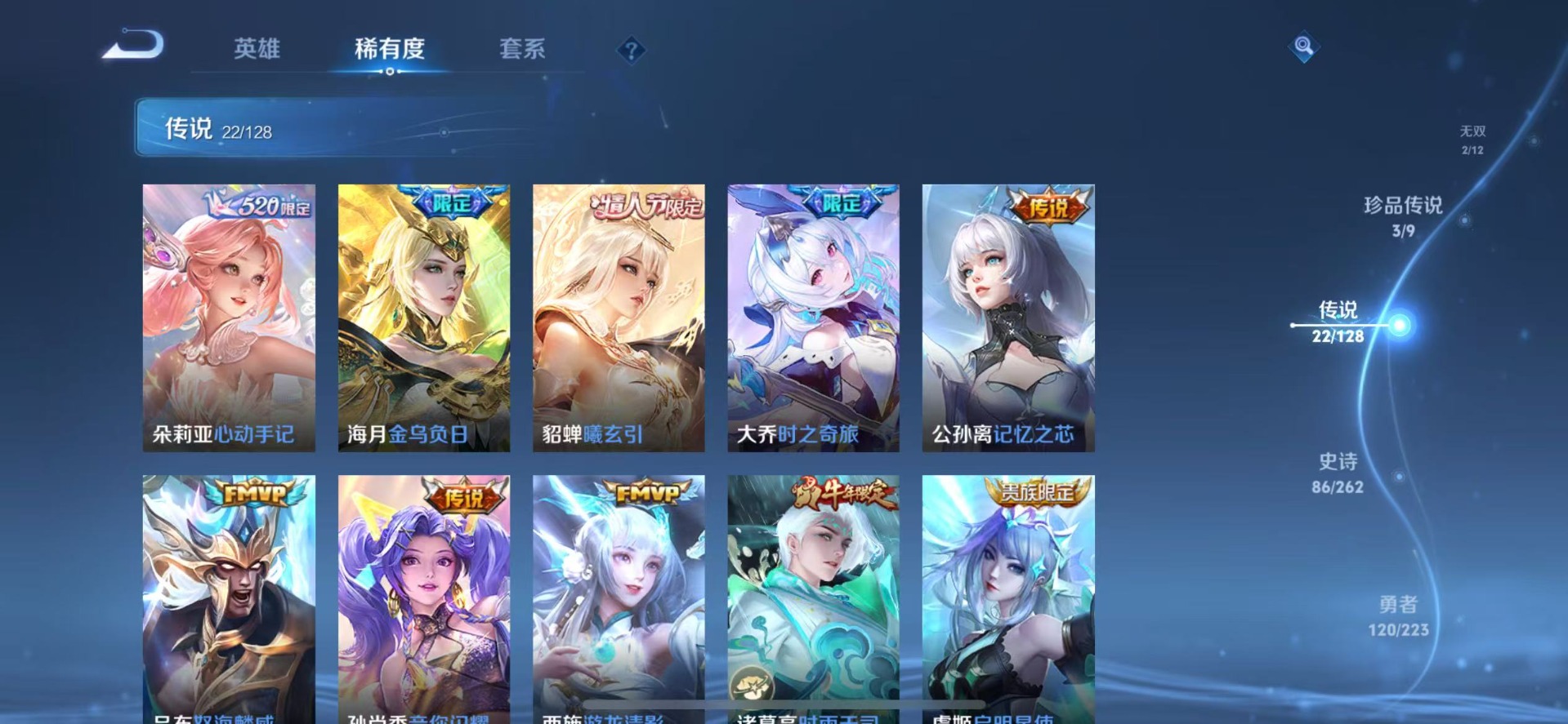 - [12175755]V8 2典藏 11传说 120英雄 171皮肤 可修改实名 优质装备:杀手不太冷,全息碎影(猴子典藏),黄金狮子座,冠军飞将,云鹰飞将(小将军),久胜战神,末日机甲-孙尚香(绿蚂蚱),地狱火,仲夏夜之梦(大飞蛾),地狱之眼,超时空战士-狄仁杰,涂山容容 珍宝阁皮:玩趣恶龙 限定皮:白虎志(电光耗子),神威(电光马子),瑞麟志(木兰年限),天狼绘梦者,朱雀志(守约年限),一生所爱,大圣娶亲,蜜橘之夏,神奇女侠 史诗皮:石田雨龙,紫霞仙子,白龙吟,黄金分割率,千年之狐,冰冠公主,偶像歌手,末日机甲-吕布,节奏热浪,女仆咖啡,水果甜心,星夜王子,德古拉伯爵,心灵战警,繁星吟游(呼啦呼啦),逐浪之夏,曙光守护者,原初追逐者,圣诞狂欢,鹰眼统帅,魅力维加斯,未来纪元-赵云