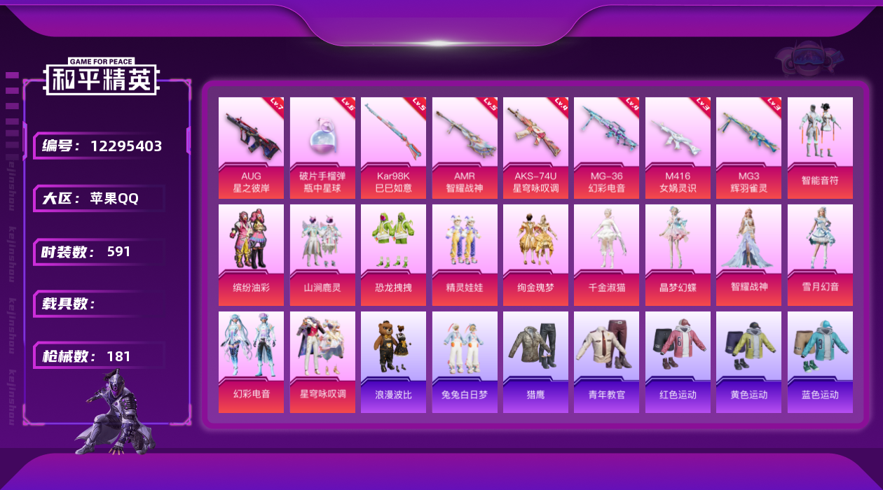 [12295403]12粉装 8特效枪 9印记 可二次 可修改实名 女号 优质装备:智能音符,缤纷油彩(猪妹猪脸妹),AUG星之彼岸,七级AUG-星之彼岸,千金淑猫,M416-女娲灵识,晶梦幻蝶,雪月幻音,智耀战神,AMR-智耀战神,破片手榴弹-瓶中星球,星穹咏叹调,AKS-74U-星穹咏叹调,MG3-辉羽雀灵,幻彩电音,MG-36-幻彩电音,Kar98K-巳巳如意 热门装扮:山涧鹿灵,绚金瑰梦,精灵娃娃,恐龙拽拽,兔兔白日梦,浪漫波比 六级特效枪:六级破片手榴弹-瓶中星球 五级特效枪:五级Kar98K-巳巳如意,五级AMR-智耀战神 四级特效枪:四级MG-36-幻彩电音,四级AKS-74U-星穹咏叹调 三级特效枪:三级M416-女娲灵识,三级MG3-辉羽雀灵 紫色装扮:田园牧歌,轻风白浪,和煦暖阳,SS22特训,白兰地假日,娇憨猪猪,梦幻奶油,萌趣咩咩,暖心熊熊,SS21特训,SS31特训套装,人气偶像,冷焰舞者,霓虹热舞,极速光影,SS30特训套装,云朵鹅,彩虹兔,雪绒豹,SS33特训套装,顶瓜瓜,时希公主,SS20特训,青春冒险家,潮流游乐家,暗夜傀儡,闪银刀客,时空追击者,暴风机械师,SS16特训,冰爽风暴,爆裂葡萄,遗落祭司,特种颜团子,猎梦纪元,飞驰魅影,音速流光,极速竞梦,SS19特训,粉团憨憨,软羊咩咩,吉莉礼服,甜心亚梦,虚音幻奏,瑞龙福将,团圆交子,醒狮腾龙,SS17特训,绿翡凌光,月蓝流光,异彩先驱,SS18特训,水晶王族,都市魅力,酒红色名流,长空猛禽,霓虹极客,霓虹街区,青年教官,缤纷果语,耀眼新星,蓝彩潮人,蓝色运动,虎虎生威吉莉,街头潮人,飞行日记,魅力单车,麻辣教官,黄色伏地魔,黄色名流,黄色运动,黎明保卫者,黑色伏地魔,极速红龙,柠萌假日,格斗先锋,深蓝色名流,幻影武者,夏日音浪,完美偶像,帅气教官,幻世战舞者,战地菁英,探宝勇士,湖蓝色名流,绮丽涂鸦,疯狂小兔子,白色伏地魔,破晓战魂,破蛋小黄鸡,甜蜜告白,福星高照,空投萌叽,突袭者,竞技达人朋克,红色运动,甜蜜熊情侣,牛气冲天,灰色格斗者,灼焰舞者,炫蓝之夏,牛气满满,猛禽,猎鹰,短笛,星途旅人,迎夏光舞,石蕴玉辉,鱼渊荷华,玉兔迎春,燕燕于飞,巳巳如意,航行童话,暗械蛇影,海琴烟,风玲,迷雾之月,熊抱抱,红熊茄茄,都市丽猫,青团波波,糖糖葫芦,棉花软糖,竞技名士,摩登魅猫,小狗蛇点点