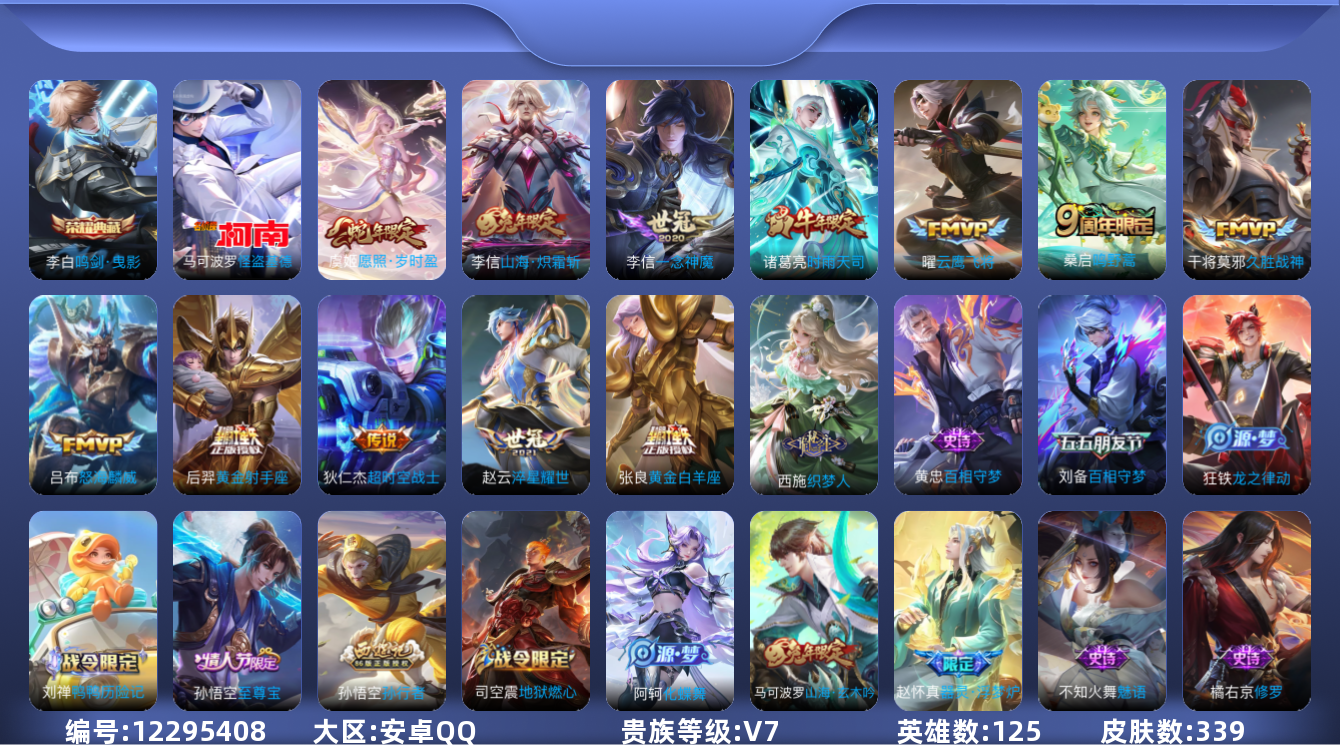 [12295408]V7 1典藏 1珍品传说 12传说 125英雄 339皮肤 可修改实名 优质装备:鸣剑·曳影,怪盗基德,黄金射手座,云鹰飞将(小将军),黄金白羊座,久胜战神,一念神魔,淬星耀世,超时空战士-狄仁杰,山海·炽霜斩(李信年限) 珍宝阁皮:胡桃夹子,优雅恋人,蔷薇恋人 限定皮:愿照·岁时盈(虞姬年限),逐霄战戟,鸣野蒿,至尊宝,魔法小厨娘,时雨天司(水龙头),遇见飞天,高山流水,怒海麟威,降魔,五谷丰年,梁祝,逐梦之音,李小龙,孙行者,神器·万象笔,山海·玄木吟(马可年限) 史诗皮:鸭鸭历险记-刘禅,器灵·浮梦炉,化蝶舞,星界战将,龙之律动,茶境仙,怒海争锋,蒙犽顽岩魄,上官婉儿群星魔术团,蔬乡物语(鲁班七号),百相守梦-黄忠,织梦人,黄金分割率,特工魅影,千年之狐,江河有灵,魅语,百解令(蒙犽),高渐离燃音魔法,蒙恬荣光圣徽,冰冠公主,偶像歌手,电玩·爆裂旋风,百相守梦(刘备),龙骑士(小龙虾),末日机甲-吕布,猫狗日记-孙策,乱世虎臣,节奏热浪,修罗,女仆咖啡,摇滚巨星,水果甜心,绅士熊喵,星夜王子,心灵骇客,功夫厨神,德古拉伯爵,暗隐猎兽者,幽灵船长,鬼剑武藏,心灵战警,地狱岩魂,纤云弄巧,拒霜思,乘风破浪,逐浪之夏,水晶猎龙者,曙光守护者,热力回旋,箭羽风息,金属风暴,原初追逐者,圣诞狂欢,圣诞恋歌,鹰眼统帅,王者之锤,魅力维加斯,黎明之约,赏金猎手,无心,未来纪元-赵云