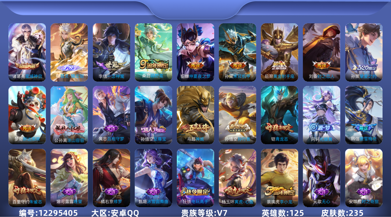 [12295405]V7 1典藏 1无双 8传说 125英雄 235皮肤 可修改实名 优质装备:星域神启(倪克斯贼亮),器灵·螭龙剑,黄金射手座,一念神魔,仲夏夜之梦(大飞蛾),胖达荣荣,时之恋人-刘备(电焊工),末日机甲-孙策,挚爱之约,涂山容容 珍宝阁皮:胡桃夹子,玩趣恶龙 限定皮:鸣野蒿,至尊宝,傲雪梅枪,神威(电光马子),瑞麟志(木兰年限),高山流水,五谷丰年,青龙志(铠年限),梁祝,李小龙,朱雀志(守约年限),孙行者,匿光追影者,寅虎·心曲(虎婆),百木心枪,唐三藏 史诗皮:化蝶舞,百相守梦-黄忠,黄金分割率,江河有灵,高渐离燃音魔法,无限星赏官,冰冠公主,青蛇,偶像歌手,晚萤,末日机甲-吕布,猫狗日记-孙策,猫狗日记-大乔,乱世虎臣,修罗,女仆咖啡,摇滚巨星,水果甜心,绅士熊喵,天才门将,星夜王子,心灵骇客,时之奇旅-安琪拉,功夫厨神,德古拉伯爵,暗隐猎兽者,幽灵船长,鬼剑武藏,心灵战警,天秀·启明,舞动绿茵,纤云弄巧,拒霜思,缤纷独角兽,乘风破浪,逐浪之夏,水晶猎龙者,金属风暴,圣诞狂欢,圣诞恋歌,鹰眼统帅,暗夜贵公子,魅力维加斯,雪上飞焰,千筹问战,无心,未来纪元-赵云