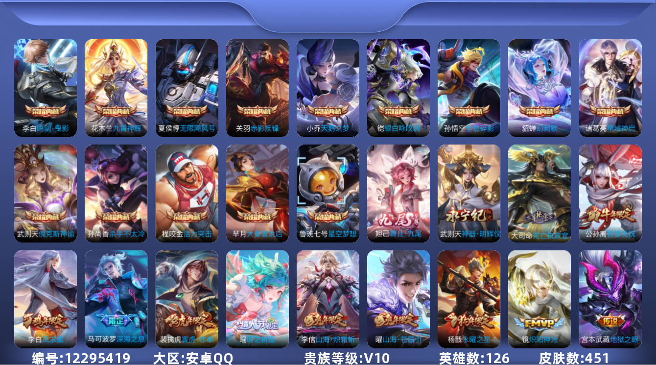 [12295419]V10 14典藏 2无双 77传说 126英雄 451皮肤 典藏英雄武则天 可修改实名 优质装备:天鹅之梦(小乔典藏),星空梦想(太空人),倪克斯神谕(宇宙婆娘),无限飓风号(高达),活力突击,杀手不太冷,大秦宣太后,鸣剑·曳影,全息碎影(猴子典藏),星域神启(倪克斯贼亮),九霄神辉(木兰典藏),赤影疾锋,银白咏叹调(倪克斯侍卫),幻阙歌(貂蝉典藏),神器·明辉仪,青丘·九尾(妲己无双),黄金狮子座,黄金射手座,冠军飞将,云鹰飞将(小将军),绛天战甲(鸡嘴战神),黄金白羊座,猫影幻舞,久胜战神,炽阳神光,一念神魔,云霓雀翎,末日机甲-孙尚香(绿蚂蚱),地狱火,仲夏夜之梦(大飞蛾),音你心动-小乔,零号·赤焰,海洋之心,地狱之眼,飞鸢探春,音你心动-周瑜,胖达荣荣,乞巧织情,时之恋人-刘备(电焊工),游龙清影(小青龙),淬星耀世,超时空战士-狄仁杰,遇见胡旋,末日机甲-孙策,花朝如约(花篮子),挚爱之约,挚爱花嫁,无双飞将,音你闪耀(rap皮),碎云,天秀幻梦,神器·狴犴令,神器·明辉仪,山海·炽霜斩(李信年限),山海·琳琅生(小乔年限),山海·苍雷引(电光曜子),炽翼辉光(娃娃菜牛角包),燃星之曲,画中仙,浮生妄,记忆之芯(机甲兔),青丘·九尾,百相守梦(张飞),追逃游戏(亚瑟),追逃游戏(安琪拉),电玩·雷克斯,鹤羽星尊,灼幽烈阳,妄想实况,艾琳觅芳踪,涂山容容 传说皮:死亡执政官,幻光神枪 珍宝阁皮:优雅恋人,蔷薇恋人 限定皮:鸣野蒿,凤求凰(白切鸡),凤凰于飞,异界灵契(白毛香),傲雪梅枪,补天,寅虎·展翼(孙膑年限),前尘镜,星穹之声,绯月行,白鹤梁神女,时雨天司(水龙头),神威(电光马子),飞衡(韩信年限),玄嵩(庄周年限),山海·碧波行(瑶年限),无限倾心-项羽,诗剑行,无限倾心-虞姬,齐天大圣,匿光决锋者,怒海麟威,降魔,五谷丰年,青龙志(铠年限),冰锋战神,幽恒(沐浴露),天狼运算者,龙胆,烈魂,虎魄,祈雪灵祝(雪兔子),玄武志(苏烈年限),朱雀志(守约年限),永曜之星,辉光之辰,默契交锋-兰陵王,默契交锋-花木兰,一生所爱,引擎之心,美猴王,寅虎·御盾(廉颇年限),寅虎·瑞焰(虎皮蛋子),寅虎·心曲(虎婆),寅虎·赤拳(老虎年限),时之祈愿-云中君,时之祈愿-瑶(瑶传限),百木心枪,玉兔公主,启示之音,无尽星芒,深海之息(深海大菠萝),唐三藏,