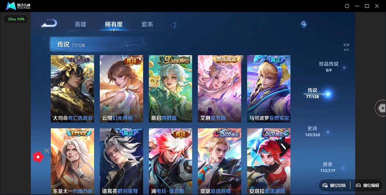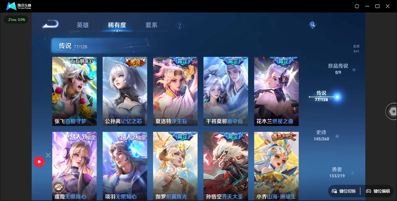 - PX_2056638-42 安卓QQ/永恒钻石/262皮肤/125英雄/1典藏/0珍品无双/0无双/0珍品传说/22传说/59史诗/9稀有英雄 【1 典藏皮肤】弑枪猎影 韩信, 【22 传说皮肤】枫霜尽 橘右京,启明星使 虞姬,云霓雀翎 虞姬,李逍遥 曜,零号·赤焰 孙悟空,夜礼服假面 狄仁杰,地狱之眼 宫本武藏,黄金射手座 后羿,怒海麟威 吕布,久胜战神 干将莫邪,末日机甲 孙尚香,乘龙·淬吴