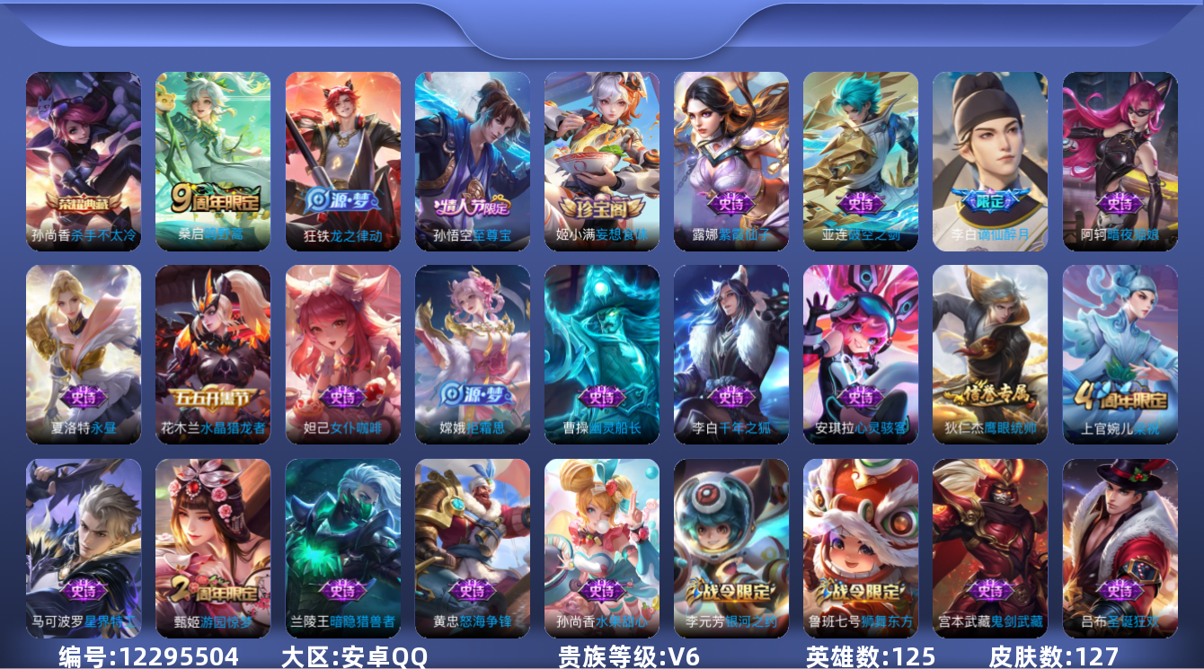 - [11819706]V10 5典藏 35传说 126英雄 413皮肤 典藏英雄武则天 可修改实名 优质装备:天鹅之梦(小乔典藏),倪克斯神谕(宇宙婆娘),无限飓风号(高达),活力突击,幻阙歌(貂蝉典藏),黄金狮子座,冠军飞将,久胜战神,炽阳神光,一念神魔,云霓雀翎,末日机甲-孙尚香(绿蚂蚱),地狱火,零号·赤焰,海洋之心,地狱之眼,超时空战士-狄仁杰,遇见胡旋,末日机甲-孙策,挚爱之约,挚爱花嫁,无双飞将,浮生妄,艾琳觅芳踪 传说皮:吕布曦玄引,落雪白狼,祥瑞亨通,幻光神枪 珍宝阁皮:蔷薇恋人,女武神 限定皮:愿照·九州拓(澜年限),逐霄战戟,鸣野蒿,太华(伽罗年限),武陵仙君(小桃花),异界灵契(白毛香),傲雪梅枪,补天,寅虎·展翼(孙膑年限),瑞麟志(木兰年限),遇见飞天,高山流水,匿光决锋者,五谷丰年,梁祝,逐梦之星,天狼征服者,李小龙,逐梦之影,玄武志(苏烈年限),朱雀志(守约年限),辉光之辰,孙行者,猪悟能,大圣娶亲,天魔缭乱,青春决赛季,女儿国国王,寅虎·瑞焰(虎皮蛋子),时之祈愿-云中君,时之祈愿-瑶(瑶传限),百木心枪,玉兔公主,启示之音,深海之息(深海大菠萝),山海·玄木吟(马可年限) 史诗皮:苍鳞隐世,器灵·浮梦炉,化蝶舞,星界特工,星界战将,灵蛊蚀心,龙之律动,茶境仙,谪仙醉月,蔬乡物语(鲁班七号),百相守梦-百里守约,紫霞仙子,苍穹之光,电玩小子(小书包),白龙吟,黄金分割率,特工魅影,千年之狐,永昼,电玩·爆裂旋风,江河有灵,高渐离燃音魔法,蒙恬荣光圣徽,偶像歌手,龙骑士(小龙虾),白蛇,暗夜猫娘,魅语,无限星赏官,晚萤,冰冠公主,末日机甲-吕布,猫狗日记-孙策,猫狗日记-大乔,乱世虎臣,节奏热浪,女仆咖啡,摇滚巨星,水果甜心,绅士熊喵,天才门将,星夜王子,心灵骇客,时之奇旅-安琪拉,功夫厨神,德古拉伯爵,暗隐猎兽者,幽灵船长,鬼剑武藏,暗渊魔法,心灵战警,乐园奇幻夜,天秀·启明,舞动绿茵,地狱岩魂,诗语江南,纤云弄巧,繁星吟游(呼啦呼啦),拒霜思,缤纷独角兽,乘风破浪,逐浪之夏,月团寄思,水晶猎龙者,曙光守护者,热力回旋,箭羽风息,金属风暴,原初追逐者,圣诞狂欢,圣诞恋歌,鹰眼统帅,暗夜贵公子,魅力维加斯,滕王阁序,无心,未来纪元-赵云