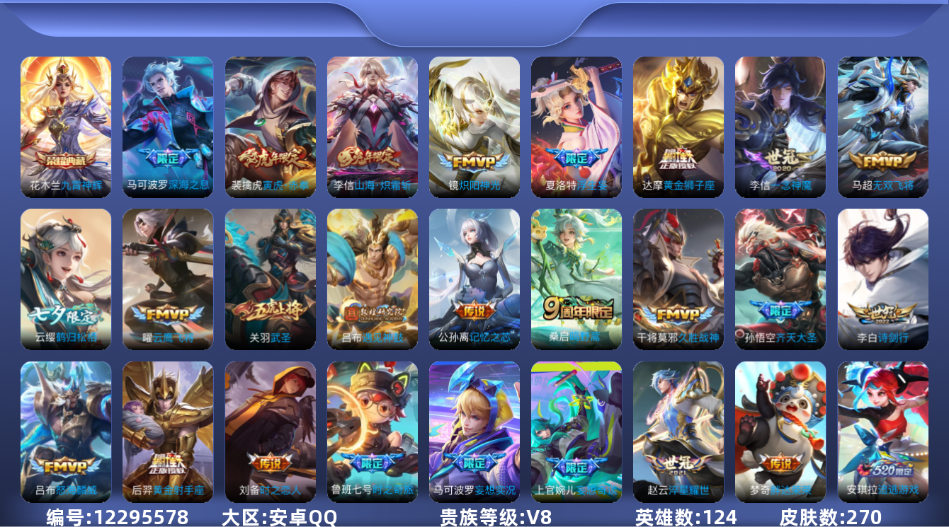 [12295578]V8 1典藏 31传说 124英雄 270皮肤 可修改实名 优质装备:九霄神辉(木兰典藏),黄金狮子座,黄金射手座,云鹰飞将(小将军),久胜战神,炽阳神光,一念神魔,音你心动-周瑜,胖达荣荣,时之恋人-刘备(电焊工),淬星耀世,无双飞将,山海·炽霜斩(李信年限),浮生妄,记忆之芯(机甲兔),百相守梦(张飞),追逃游戏(安琪拉),电玩·雷克斯,灼幽烈阳,妄想实况,妄想奇谈,鹤归松栖(云缨),遇见神鼓,鲁班七号-时之奇旅 珍宝阁皮:妄想食味 限定皮:鸣野蒿,至尊宝,傲雪梅枪,山海·碧波行(瑶年限),诗剑行,齐天大圣,怒海麟威,武圣,李小龙,默契交锋-花木兰,引擎之心,寅虎·赤拳(老虎年限),深海之息(深海大菠萝),山海·玄木吟(马可年限) 史诗皮:鸭鸭历险记-刘禅,星界战将,谪仙醉月,龙之律动,破空之剑,蒙犽顽岩魄,乘龙·聚宝船(安琪拉年限),百相守梦-黄忠,织梦人,紫霞仙子,特工魅影,永昼,江河有灵,匿光侦查者,鹤归松栖(赵怀真),高渐离燃音魔法,蒙恬荣光圣徽,匿光破解者,冰冠公主,电玩·爆裂旋风,百相守梦(刘备),暗夜猫娘,银翎春语,末日机甲-吕布,猫狗日记-孙策,时之恋人-孙尚香,修罗,女仆咖啡,摇滚巨星,水果甜心,天才门将,功夫厨神,德古拉伯爵,暗隐猎兽者,幽灵船长,鬼剑武藏,暗渊魔法,心灵战警,天秀·启明,纤云弄巧,缤纷独角兽,逐浪之夏,水晶猎龙者,曙光守护者,箭羽风息,唤灵魅影,金属风暴,原初追逐者,圣诞恋歌,鹰眼统帅,魅力维加斯,赏金猎手,天秀·音浪,无心,玫瑰异探
