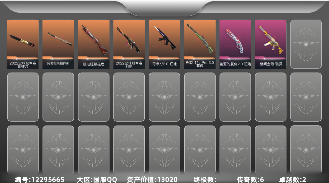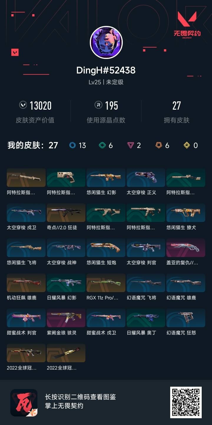 [12295665]6橙皮 2紫皮 27皮肤 9英雄 28卡面 195已用源晶 未定级 优质装备:狂徒-奇点//2.0,雄鹿-机动狂飙,阿特拉斯指挥部,骇灵-紫阙金琅 亮点皮肤:幻影-2022全球冠军赛,2022全球冠军赛 蝴蝶刀 套装:2022全球冠军赛 佩枪皮肤:短炮-盖亚的复仇2.0 狙击枪皮肤:莽侠-RGX 11z Pro 3.0