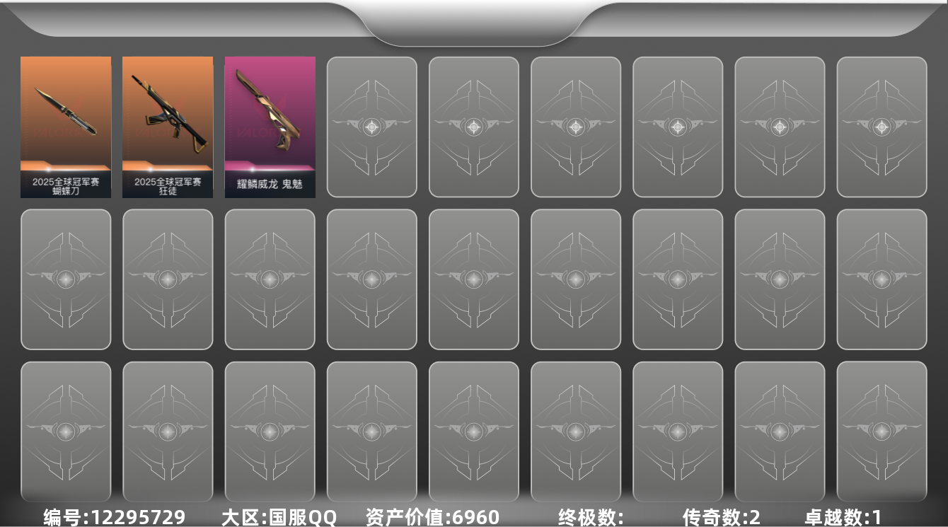 [12295729]2橙皮 1紫皮 3皮肤 9英雄 12卡面 80已用源晶 未定级 优质装备:2025全球冠军赛 蝴蝶刀,鬼魅-耀鳞威龙,2025全球冠军赛 狂徒
