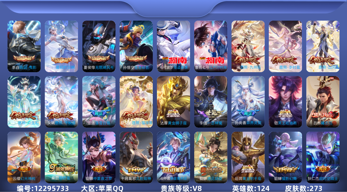 [12295733]V8 4典藏 2珍品传说 24传说 124英雄 273皮肤 可修改实名 优质装备:无限飓风号(高达),鸣剑·曳影,全息碎影(猴子典藏),最初的交响(伽罗典藏),江户川柯南,怪盗基德,黄金狮子座,黄金射手座,猫影幻舞,久胜战神,一念神魔,仲夏夜之梦(大飞蛾),淬星耀世,超时空战士-狄仁杰,遇见胡旋,炽翼辉光(娃娃菜牛角包),云中君群星魔术团 传说皮:吕布曦玄引,落雪白狼,铠冥王哈迪斯,幻光神枪 珍宝阁皮:玩趣恶龙 限定皮:愿照·九州拓(澜年限),愿照·福禄聚(蔡文姬年限),愿照·岁时盈(虞姬年限),愿照·山河定(司空震年限),愿照·众生和(妲己年限),愿照·千秋盛(女娲年限),鸣野蒿,异界灵契(白毛香),傲雪梅枪,天狼绘梦者,李小龙,朱雀志(守约年限),霸王别姬-虞姬,一生所爱,大圣娶亲,匿光追影者,玉兔公主 史诗皮:苍鳞隐世,器灵·浮梦炉,星界战将,石田雨龙,茶境仙,怒海争锋,破空之剑,战舞者,蒙犽顽岩魄,埋骨钱,海诺心动手记,决胜骁骑,上官婉儿群星魔术团,蔬乡物语(鲁班七号),百相守梦-百里守约,电玩小子(小书包),黄金分割率,特工魅影,千年之狐,永昼,冰冠公主,青蛇,偶像歌手,暗夜猫娘,龙骑士(小龙虾),猫狗日记-孙策,乱世虎臣,节奏热浪,修罗,女仆咖啡,摇滚巨星,水果甜心,绅士熊喵,星夜王子,心灵骇客,功夫厨神,德古拉伯爵,幽灵船长,鬼剑武藏,心灵战警,天秀·启明,舞动绿茵,地狱岩魂,诗语江南,纤云弄巧,繁星吟游(呼啦呼啦),拒霜思,缤纷独角兽,乘风破浪,逐浪之夏,月团寄思,水晶猎龙者,曙光守护者,箭羽风息,金属风暴,原初追逐者,圣诞狂欢,圣诞恋歌,鹰眼统帅,魅力维加斯,黎明之约,奇遇舞章