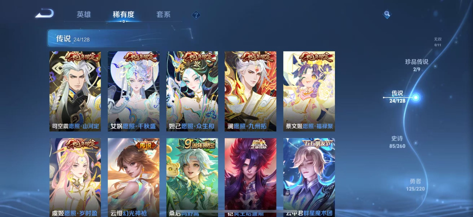 孙尚香异界灵契,露娜一生所爱,镜匿光追影者,公孙离玉兔公主,司空震愿照·山河定,裴擒虎李小龙,上官婉儿天狼绘梦者,桑启鸣野蒿,女娲愿照·千秋盛,孙悟空大圣娶亲,妲己愿照·众生和,韩信傲雪梅枪,百里守约朱雀志,蔡文姬愿照·福禄聚,澜愿照·九州拓,虞姬霸王别姬,虞姬愿照·岁时盈