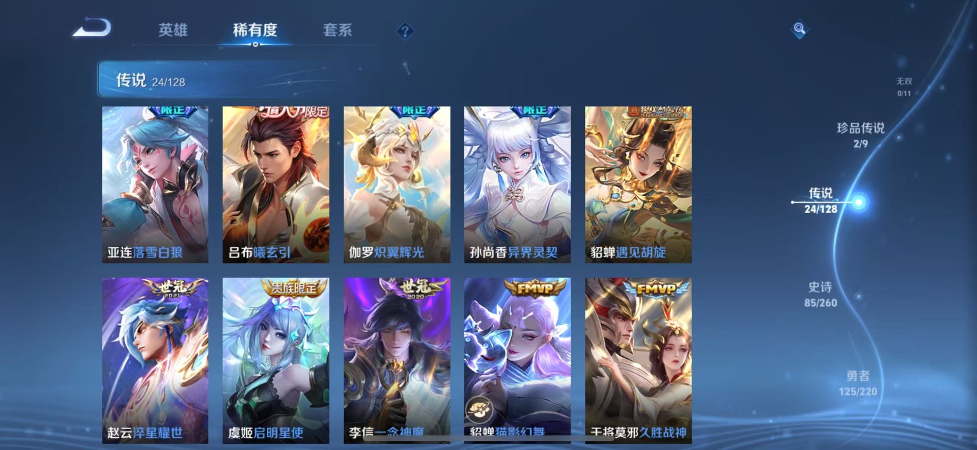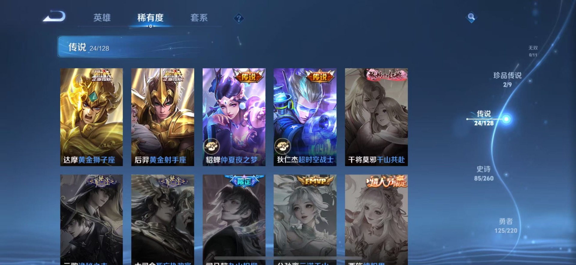 - [11546830]V7 4传说 123英雄 163皮肤 可修改实名 优质装备:末日机甲-孙尚香(绿蚂蚱) 珍宝阁皮:女武神 限定皮:鸣野蒿,至尊宝,凤凰于飞,太华(伽罗年限),时之彼端,白晶晶,时雨天司(水龙头),遇见飞天,梁祝,奔雷神使(牛魔年限),天狼绘梦者,李小龙,如梦令-嫦娥,如梦令-后羿,霸王别姬-项羽,霸王别姬-虞姬,默契交锋-花木兰,冰霜恋舞曲 史诗皮:百相守梦-黄忠,紫霞仙子,龙骑士(小龙虾),白蛇,暗夜猫娘,晚萤,冰冠公主,青蛇,女仆咖啡,水果甜心,心灵骇客,鬼剑武藏,心灵战警,舞动绿茵,纤云弄巧,繁星吟游(呼啦呼啦),缤纷独角兽,水晶猎龙者,箭羽风息,金属风暴,圣诞恋歌,鹰眼统帅,王者之锤,魅力维加斯