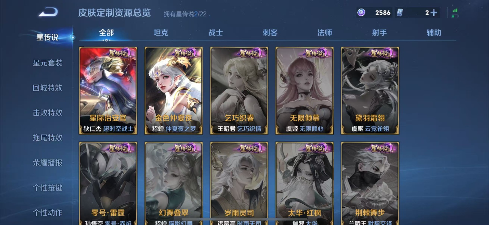 海诺心动手记,刘邦德古拉伯爵,夏侯惇乘风破浪,阿轲暗夜猫娘,阿轲节奏热浪,铠曙光守护者,曹操幽灵船长,伽罗箭羽风息,廉颇地狱岩魂,小乔缤纷独角兽,小乔青蛇,孙策猫狗日记,赵怀真器灵·浮梦炉,鲁班七号电玩小子,吕布圣诞狂欢,诸葛亮黄金分割率,刘禅绅士熊喵,宫本武藏鬼剑武藏,貂蝉圣诞恋歌,花木兰水晶猎龙者,李白千年之狐,夏洛特永昼,上官婉儿群星魔术团,安琪拉心灵骇客,艾琳奇遇舞章,杨戬天秀·启明,西施诗语江南,白起星夜王子,白起苍鳞隐世,亚瑟心灵战警,嬴政摇滚巨星,程咬金功夫厨神,百里玄策原初追逐者,雅典娜冰冠公主,雅典娜黎明之约,百里守约特工魅影,李元芳逐浪之夏,墨子龙骑士,墨子金属风暴,蔡文姬舞动绿茵,王昭君偶像歌手,嫦娥拒霜思,橘右京修罗,关羽决胜骁骑