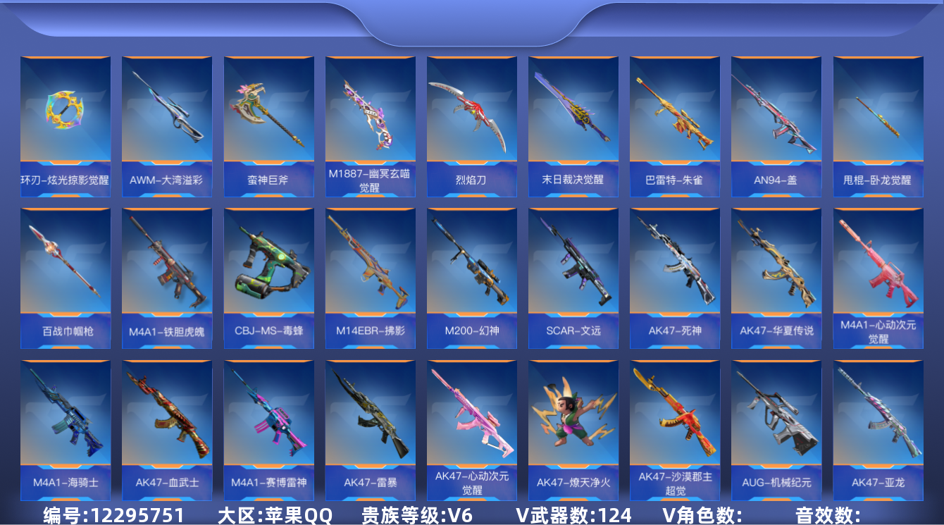 [12295751]可二次 可修改实名 V6 124英雄武器 272万化 大师SS 武器:M200-幻神,SCAR-文远,M4A1-黑骑士,AK47-雷暴,M4A1-雷神,AK47-死神,AK47-无影,AK47-无影-葵,AK47-燎天净火,巴雷特-金色蔷薇,巴雷特-极光,巴雷特-毁灭,AUG-机械纪元,双持斯泰尔-天使,M4A1-心动次元觉醒,M4A1-赛博雷神,M4A1-海骑士,AK47-亚龙,AK47-华夏传说,AK47-沙漠郡主-超觉,AK47-心动次元觉醒,AK47-血武士,AK12-天启,SCAR-探星者,M200-心动次元觉醒,AWM-裁决,AWM-天龙,M200-心动次元,MR1-幽暗骑士,CBJ-MS-毒蜂,地狱火,QCW05-变形金刚·大黄蜂,CZS2-心动次元觉醒,KSG-火力竞放,M1216-血月,M14EBR-拂影,AK47-破空冰刃,铁锹-孟德,沙鹰-修罗,USP-机械迷城,斩神刀-雷暴,擎天觉醒,百战巾帼枪,马来剑-毁灭,尼泊尔-冰锋觉醒,M4A1-铁胆虎魄,双持沙鹰-亚龙,丛林匕首-火力竞放,麒麟刺,双持尼泊尔-亚龙,屠龙,唐刀-大唐荣耀,秋逸觉醒,血月,黑骑士手雷,燃烧弹-游骑兵,雷神手雷,高爆手雷-无限,甩棍-卧龙觉醒,卡牌大师-悠悠,AN94-盖,巴雷特-朱雀,末日裁决觉醒,M1887-幽冥玄喵觉醒,烈焰刀,蛮神巨斧,AWM-大湾溢彩,环刃-炫光掠影觉醒