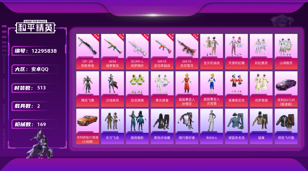 [12295838]11粉装 5特效枪 2载具 10印记 可二次 可修改实名 女号 优质装备:宾利BATUR(极速紫),宾利欧陆GT敞篷(火焰橘),宝贝奶油派,天使彩虹糖,M416全功率超战,M416风花雪月,SCAR-L纯梦嫁纱,AKM绿萝繁花 热门装扮:飓风飞鹰,彩虹鹿灵,山涧鹿灵,沙场疾风,恐龙拽拽,寒光使者,音爆索尼克,超级赛亚人孙悟空,超级赛亚人贝吉塔,闲梦青缨,东方飞龙,暗夜魅影 稀有枪皮:DP-28-豹影疾电 五级特效枪:五级DP-28-豹影疾电,五级M416-全功率超战,五级SCAR-L-纯梦嫁纱,五级AKM-绿萝繁花 三级特效枪:三级M416-风花雪月 紫色装扮:田园牧歌,轻风白浪,和煦暖阳,SS22特训,莱茵河畔,孙悟空,SS23特训,幻彩翩翩,妙红点点,娇憨猪猪,酸甜橘柚,夏雨游龙,萌趣咩咩,SS21特训,绚烂繁星,熠彩粉晶,冷焰舞者,北国孤狼,午夜朋克,SS33特训套装,青涩时光,SS20特训,SS15特训,时空追击者,暴风机械师,SS16特训,爆裂葡萄,萌趣颜团子,特种颜团子,猎梦纪元,飞驰魅影,音速流光,极速竞梦,SS19特训,覆海蛟龙,甜心亚梦,虚音幻奏,电音精灵,瑞龙福将,团圆交子,醒狮腾龙,SS17特训,极乐追光,异彩先驱,SS18特训,都市漫游者,都市魅力,野性山猫,野性战心,野性战魂,长空猛禽,雷霆特警,霓虹极客,霓虹街区,青春校园,迎春赐吉,缤纷果语,耀眼新星,花园小羊咩,蓝色守护者,虎虎生威吉莉,血色贵族,西部风情,风行保卫者,飞行日记,龙腾端午,骑行爱好者,魅力单车,鹤鸣,麻辣教官,黑色伏地魔,龙的传人,龟仙人,柠萌假日,格斗先锋,棕色飞行服,水手小飞鸭,沙漠探路者,活力之魂,涂山之恋,滨海假日,夏日音浪,夜莺强袭者,幻世战舞者,怒火燎原,探宝勇士,湖蓝色名流,滨海厨神,白熊同盟,破蛋小黄鸡,神秘领域,福星高照,空岛之星,空投萌叽,突袭者,甜蜜熊情侣,王牌教练,牛气冲天,灼焰舞者,炫蓝之夏,燃烧卡路里,牛气满满,猛禽,特战装甲,短笛,玉兔迎春,竞技名士,惊鸿侠骨,贝吉塔,究极悟饭,神气柴柴,懵萌河马,SS24特训(SS24特训套装),SS25特训,锦衣飞扬,粉红小猪,菲菲,SS27特训,星河浪客,华灯初上,日照花林,沙丘之歌,SS26特训,春光漫游,快闪甜心,薄荷蓝莓,耀粉歌者,绯格组合,萌黄之夏,水银刺客,光之冒险,海上生明月