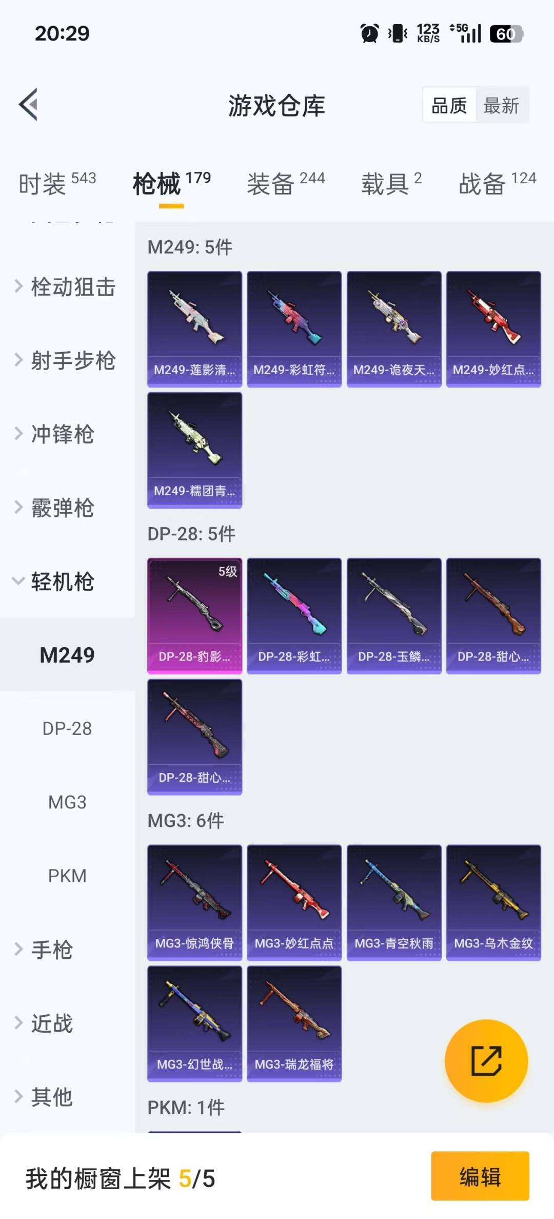 - [11657767]3粉装 6特效枪 12印记 可二次 可修改实名 身法装备:舞王派对(派对舞王、小金鞋),8号机(新粉螳螂) 优质装备:舞王派对(派对舞王、小金鞋),M416心之恋语,洛天依,AKM绿萝繁花,SCAR-L-锦绣绵绵,七级M416-心之恋语,UMP45量子极限,Kar98K-巳巳如意 热门装扮:炫光之旅,金丰海韵,梦魇先生,派对舞王(小金鞋) 稀有枪皮:DP-28-豹影疾电 五级特效枪:五级UMP45-量子极限,五级Kar98K-巳巳如意,五级DP-28-豹影疾电,五级SCAR-L-锦绣绵绵,五级AKM-绿萝繁花 紫色装扮:田园牧歌,轻风白浪,和煦暖阳,SS22特训,SS23特训,幻彩翩翩,妙红点点,娇憨猪猪,萌趣咩咩,SS21特训,绚烂繁星,SS31特训套装,六六大吉,冰川特警,霓虹热舞,旭日情侣,SS30特训套装,SS33特训套装,青涩时光,顶瓜瓜,SS20特训,SS16特训,萌趣颜团子,特种颜团子,猎梦纪元,飞驰魅影,音速流光,SS19特训,竞技角斗士,覆海蛟龙,甜心亚梦,虚音幻奏,瑞龙福将,团圆交子,SS17特训,冰川谧蓝,异彩先驱,SS18特训,都市漫游者,酒红色名流,野性战心,长空猛禽,霓虹极客,霓虹街区,缤纷果语,蓝色运动,虎虎生威吉莉,无面战甲,飞行日记,龙腾端午,骑行爱好者,鹤鸣,黄色名流,黄色运动,黎明保卫者,黑色伏地魔,龙的传人,龟仙人,冰河战士,龙魂突击队,蝶变,香桃花海,柠萌假日,沙漠兵团,活力之心,海岛探路者,滨海假日,幻影武者,幻世战舞者,探宝勇士,湖蓝色名流,滨海厨神,破晓战魂,甜蜜告白,福星高照,空岛之星,空投萌叽,红色运动,王牌教练,灰色格斗者,炫蓝之夏,热血青春,小熊娃娃,雏菊兔兔,萝兰蝴蝶,SS29特训,先驱飞行员,星途旅人,创世·幻影,纯真浪花,热情海星,曼妙人鱼,SS28特训,8号机(新粉螳螂),异域银装,鱼渊荷华,玉兔迎春,燕燕于飞,巳巳如意,风玲,青团波波,糖糖葫芦,棉花软糖,竞技名士,街头风暴,银尘,惊鸿侠骨,SS24特训(SS24特训套装),SS25特训,绝对偶像,金戈铁马,锦衣飞扬,粉红小猪,焰鹰斗篷,幻羽潜行,幽夜迷踪,SS27特训,明鸳圣池,日照花林,SS26特训,春光漫游,快闪甜心,贝斯之夜,智谋强哥,大橘大利,耀粉歌者,春日漫步,粉恋花,蓝冰羽,紫幽梦,SS32特训服(SS32特训套装),瑰梦爱神,绯格组合