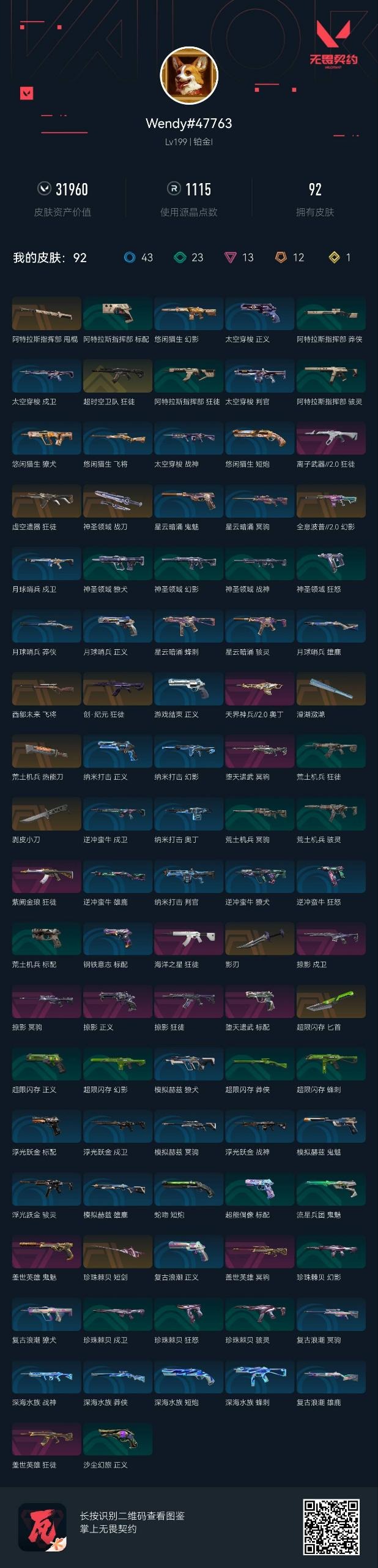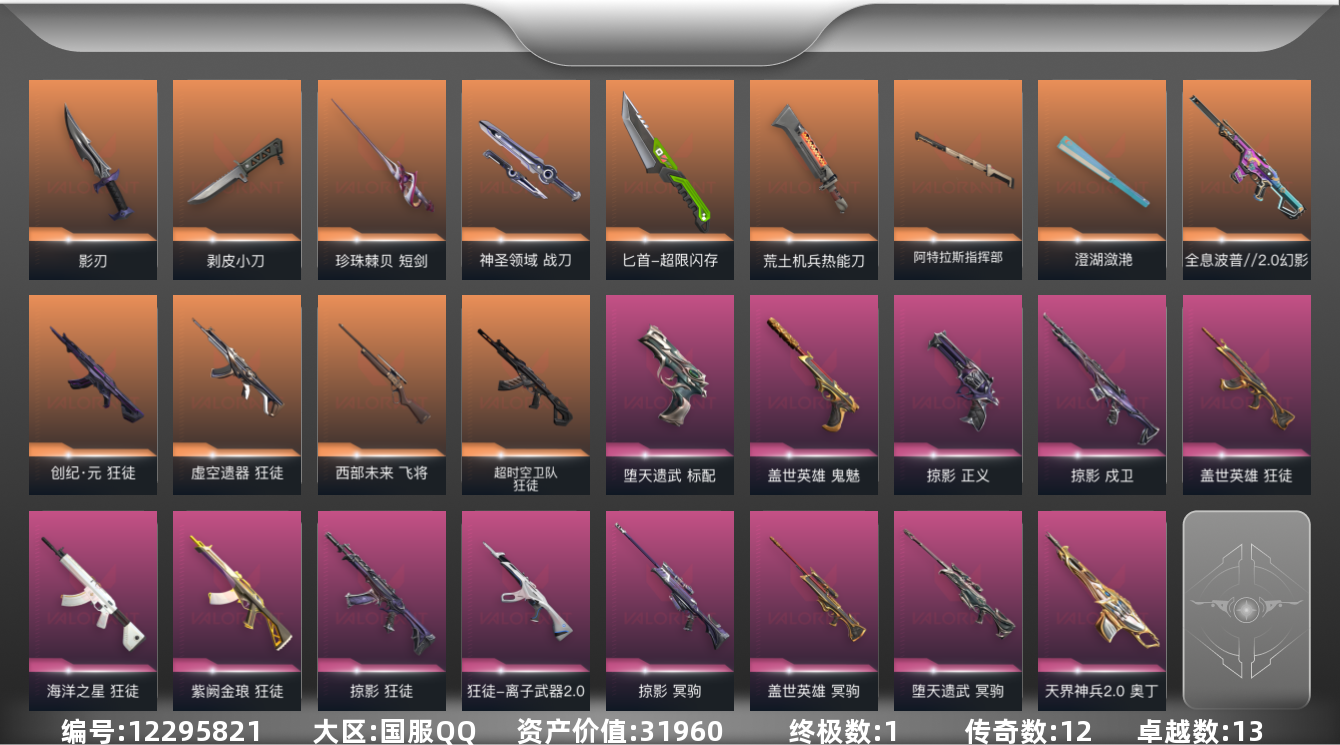 [12295821]12橙皮 1金皮 13紫皮 92皮肤 27英雄 139卡面 1115已用源晶 铂金 优质装备:掠影套装,狂徒-掠影,狂徒-紫阙金琅,冥驹-堕天遗武,幻影-全息波普//2.0,正义-掠影,冥驹-掠影,戍卫-掠影,澄湖潋滟,鬼魅-盖世英雄,狂徒-盖世英雄,剥皮小刀,奥丁-天界神兵2.0,匕首-超限闪存,影刃,荒土机兵热能刀,神圣领域 战刀,阿特拉斯指挥部,标配-堕天遗武 步枪皮肤:狂徒-超时空卫队,狂徒-离子武器2.0,狂徒-创·纪元,狂徒-虚空遗器,狂徒-海洋之星 狙击枪皮肤:飞将-西部未来,冥驹-盖世英雄 近战武器皮肤:短剑-珍珠棘贝
