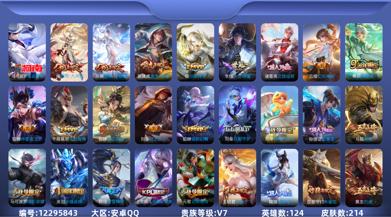 [12295843]V7 1珍品传说 13传说 124英雄 214皮肤 可修改实名 优质装备:怪盗基德,猫影幻舞,久胜战神,炽阳神光,一念神魔,仲夏夜之梦(大飞蛾),时之恋人-刘备(电焊工),遇见胡旋 传说皮:幻光神枪 珍宝阁皮:蔷薇恋人,玩趣恶龙 限定皮:愿照·九州拓(澜年限),愿照·千秋盛(女娲年限),逐霄战戟,鸣野蒿,至尊宝,凤凰于飞,武陵仙君(小桃花),傲雪梅枪,神威(电光马子),遇见飞天,高山流水,五谷丰年,冰锋战神,幽恒(沐浴露),梁祝,逐梦之星,烈魂,天狼绘梦者,李小龙,朱雀志(守约年限),如梦令-嫦娥,寅虎·赤拳(老虎年限) 史诗皮:鸭鸭历险记-刘禅,器灵·浮梦炉,紫霞仙子,苍穹之光,黄金分割率,特工魅影,魅语,蒙恬荣光圣徽,青蛇,偶像歌手,百相守梦(刘备),龙骑士(小龙虾),猫狗日记-大乔,节奏热浪,女仆咖啡,摇滚巨星,水果甜心,天才门将,功夫厨神,德古拉伯爵,暗隐猎兽者,舞动绿茵,地狱岩魂,诗语江南,繁星吟游(呼啦呼啦),拒霜思,乘风破浪,水晶猎龙者,箭羽风息,金属风暴,原初追逐者,圣诞狂欢,圣诞恋歌,鹰眼统帅,暗夜贵公子,魅力维加斯,黎明之约