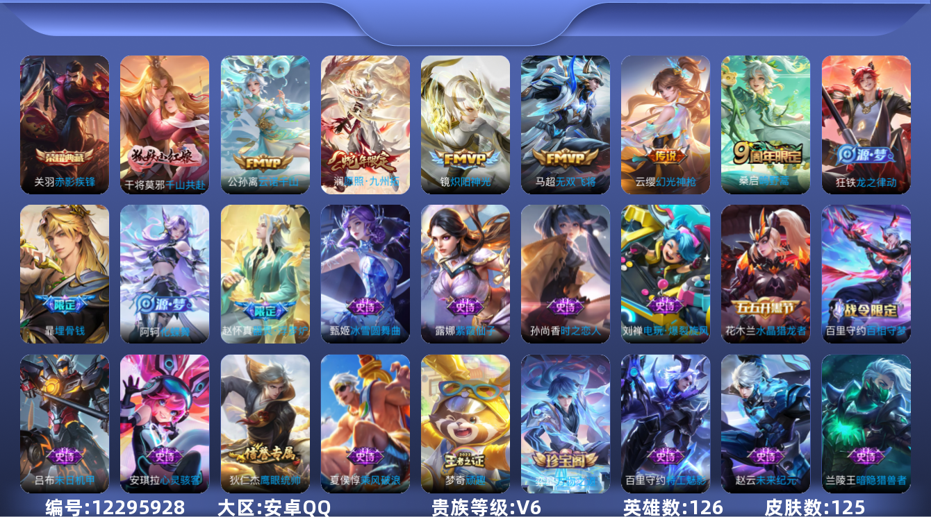 - [12148198]V9 2典藏 1珍品无双 1无双 2珍品传说 36传说 124英雄 363皮肤 可修改实名 优质装备:馥梦繁花,九霄神辉(木兰典藏),幻阙歌(貂蝉典藏),花合斗,酷洛米之心,大耳狗之梦,黄金射手座,云鹰飞将(小将军),绛天战甲(鸡嘴战神),猫影幻舞,久胜战神,炽阳神光,一念神魔,云霓雀翎,仲夏夜之梦(大飞蛾),地狱之眼,胖达荣荣,时之恋人-刘备(电焊工),游龙清影(小青龙),淬星耀世,超时空战士-狄仁杰,遇见胡旋,挚爱之约,神器·狴犴令,山海·炽霜斩(李信年限),浮生妄,澜逐花归海,涂山容容 传说皮:铠冥王哈迪斯,幻光神枪 珍宝阁皮:妄想食味,蔷薇恋人 限定皮:鸣野蒿,夏侯惇霜北刀,异界灵契(白毛香),傲雪梅枪,前尘镜,星穹之声,绯月行,白鹤梁神女,时雨天司(水龙头),神威(电光马子),无限倾心-项羽,高山流水,诗剑行,怒海麟威,五谷丰年,冰锋战神,游园惊梦,梁祝,御风骁将(吕布年限),天狼狩猎者,天狼溯光者,朱雀志(守约年限),霸王别姬-虞姬,默契交锋-兰陵王,默契交锋-花木兰,孙行者,一生所爱,冰霜恋舞曲,蜜橘之夏,寅虎·御盾(廉颇年限),枫霜尽,时之奇旅-妲己,神器·万象笔 史诗皮:飞车小橘子,器灵·浮梦炉,化蝶舞,星界战将,茶境仙,炽弈燎原,破空之剑,战舞者,涂山红红,蒙犽顽岩魄,埋骨钱,芈月浮光幕影,海诺心动手记,百相守梦-百里守约,紫霞仙子,苍穹之光,电玩小子(小书包),白龙吟,黄金分割率,特工魅影,千年之狐,闲日渔趣,魅语,百解令(蒙犽),蒙恬荣光圣徽,无限星赏官,冰冠公主,青蛇,暗夜猫娘,末日机甲-吕布,猫狗日记-孙策,猫狗日记-大乔,乱世虎臣,节奏热浪,修罗,女仆咖啡,摇滚巨星,水果甜心,绅士熊喵,天才门将,星夜王子,心灵骇客,时之奇旅-安琪拉,功夫厨神,德古拉伯爵,暗隐猎兽者,幽灵船长,鬼剑武藏,暗渊魔法,心灵战警,天秀·启明,舞动绿茵,地狱岩魂,纤云弄巧,拒霜思,缤纷独角兽,乘风破浪,逐浪之夏,月团寄思,水晶猎龙者,曙光守护者,热力回旋,箭羽风息,金属风暴,原初追逐者,圣诞狂欢,圣诞恋歌,鹰眼统帅,暗夜贵公子,魅力维加斯,黎明之约,滕王阁序,寅虎·御盾,无心,未来纪元-赵云,玫瑰异探