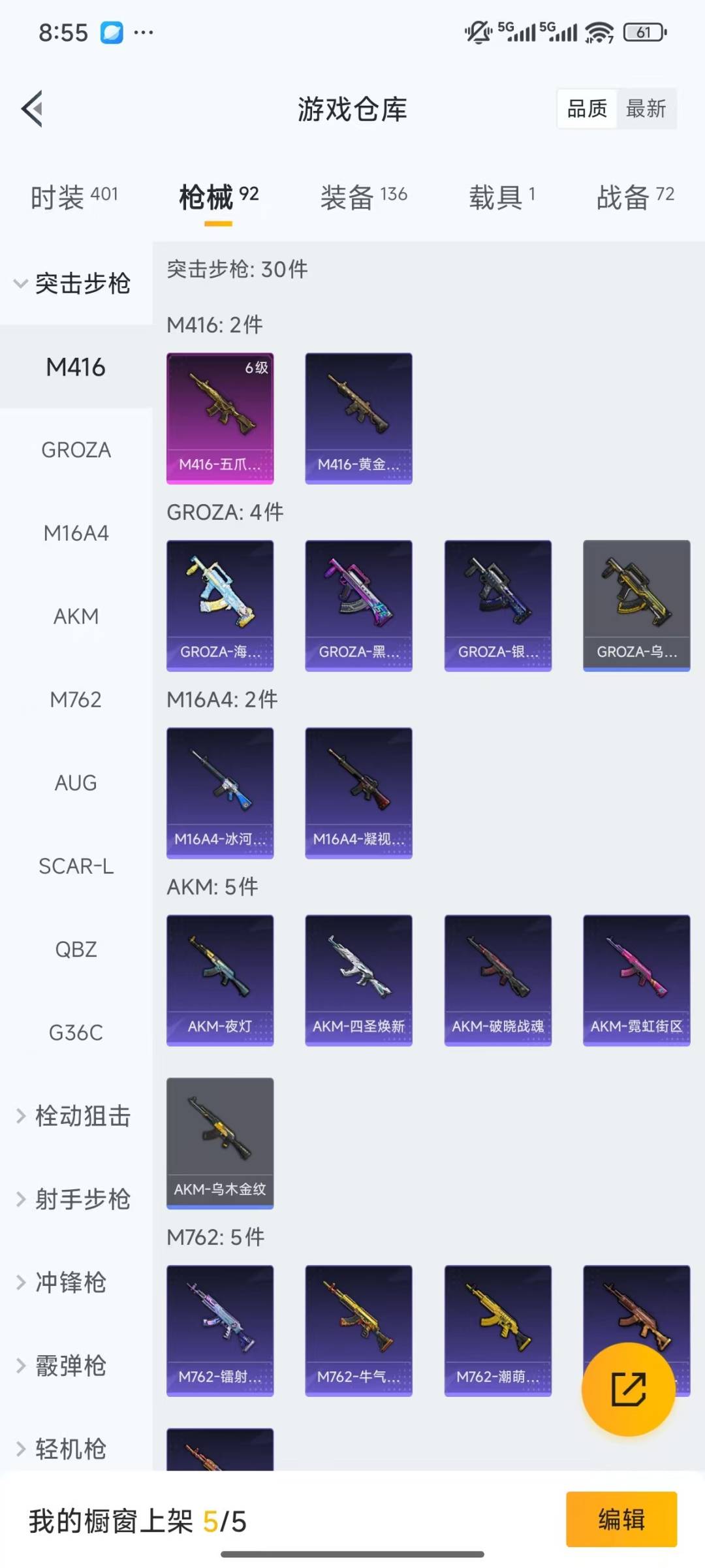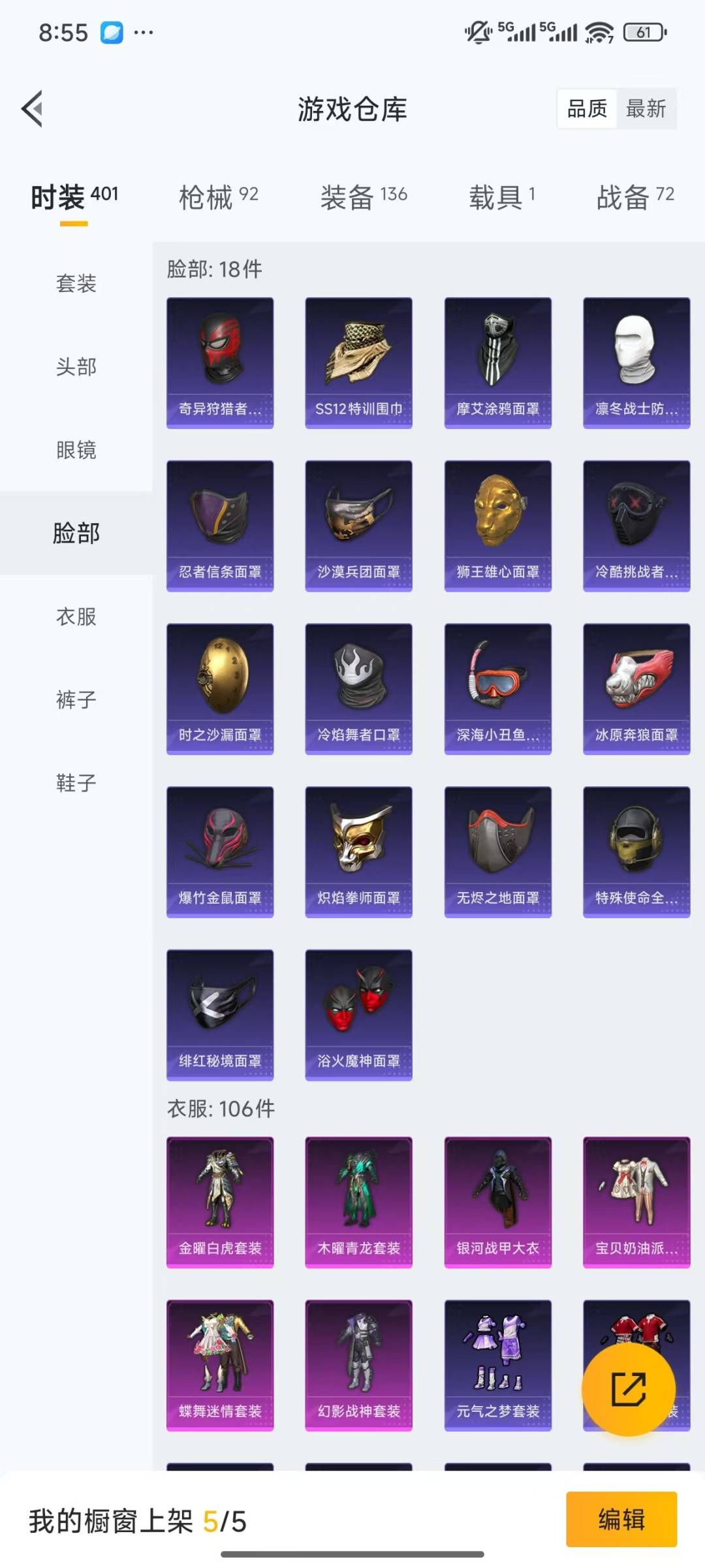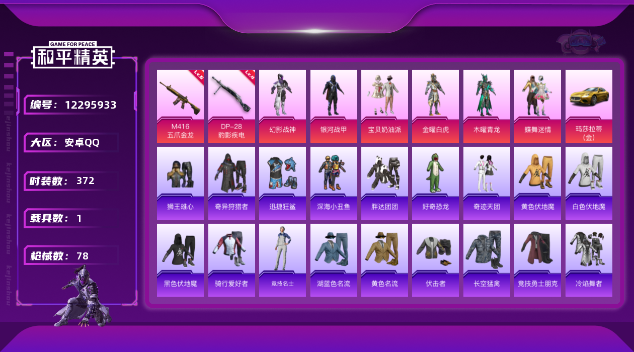 [12295933]6粉装 2特效枪 1载具 可二次 可修改实名 优质装备:玛莎拉蒂Ghibli(金),M416五爪金龙,奇异狩猎者,蝶舞迷情,幻影战神,宝贝奶油派,银河战甲,木曜青龙,金曜白虎 热门装扮:奇迹天团,胖达团团,狮王雄心,迅捷狂鲨,深海小丑鱼,好奇恐龙,绯红秘境 稀有枪皮:DP-28-豹影疾电 六级特效枪:六级M416-五爪金龙 四级特效枪:四级DP-28-豹影疾电 紫色装扮:SS5特训,伏击者,冷焰舞者,凛冬战士,北国孤狼,SS15特训,SS16特训,银白舞王,SS13特训,SS14特训,SS17特训,SS18特训,酷萌兔限定,金鼠迎春,长空猛禽,雪山征服者,雪山精英,霓虹街区,荣耀,跃动心情,骑行爱好者,魅力单车,黄色伏地魔,黄色名流,黑色伏地魔,格斗先锋,沙漠兵团,圣诞大吉,怒火燎原,战地督导,战地菁英,湖蓝色名流,疯狂小兔子,白色伏地魔,甜蜜告白,福星高照,竞技勇士朋克,潮流先锋,灰色格斗者,熔岩使者,燃烧卡路里,牛气满满,特战装甲,特殊使命,特训学院,镭射皇者,竞技名士,精神漫游,炽焰拳师,格斗专家,SS6特训,核芯基因,拳皇97八神庵,SS7特训,火舞潮人,淡雅花蕊,裁决冥王,浴火魔神,摩艾涂鸦,奇趣章鱼,时之沙漏,SS8特训,粉甜马卡龙,原初圣火,逆风勇士,SS12特训,SS9特训,SS11特训,绯格组合,蓝调潮人,冷酷挑战者,摇滚战魂,绯红秘境,无烬之地,冰原奔狼,忍者信条,WiFi精灵,丛林猎人,传奇侦探,奇趣企鹅,爆竹金鼠 优质战备:幻影战神降落伞,甜心宝贝降落伞,凝视深渊降落伞,至尊龙雀飞行服,至尊龙雀降落伞,银河战甲降落伞,春暖花开降落伞,深海曼妙降落伞,洛神天依降落伞