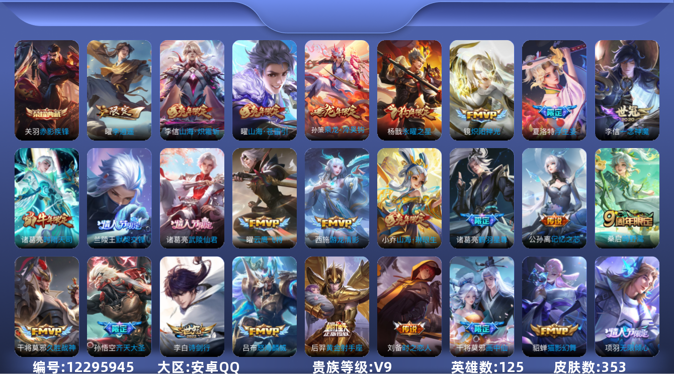 [12295945]V9 1典藏 35传说 125英雄 353皮肤 可修改实名 优质装备:赤影疾锋,黄金射手座,云鹰飞将(小将军),绛天战甲(鸡嘴战神),猫影幻舞,久胜战神,炽阳神光,一念神魔,云霓雀翎,地狱火,李逍遥,乞巧织情,时之恋人-刘备(电焊工),游龙清影(小青龙),淬星耀世,山海·炽霜斩(李信年限),山海·琳琅生(小乔年限),山海·苍雷引(电光曜子),燃星之曲,画中仙,浮生妄,记忆之芯(机甲兔),百相守梦(张飞),鹤羽星尊,惊梅引 传说皮:乘龙·淬吴钩(孙策年限) 珍宝阁皮:妄想食味,优雅恋人,女武神 限定皮:鸣野蒿,武陵仙君(小桃花),魔法小厨娘,时雨天司(水龙头),神威(电光马子),山海·碧波行(瑶年限),无限倾心-项羽,高山流水,诗剑行,齐天大圣,怒海麟威,五谷丰年,青龙志(铠年限),幽恒(沐浴露),游园惊梦,梁祝,天狼狩猎者,龙胆,烈魂,虎魄,天狼绘梦者,李小龙,逐梦之影,逐梦之光,玄武志(苏烈年限),朱雀志(守约年限),永曜之星,默契交锋-兰陵王,真爱至上,引擎之心,寅虎·心曲(虎婆),唐三藏,山海·玄木吟(马可年限) 史诗皮:星界战将,石田雨龙,蔬乡物语(鲁班七号),乘龙·聚宝船(安琪拉年限),百相守梦-黄忠,紫霞仙子,苍穹之光,白龙吟,黄金分割率,特工魅影,千年之狐,电玩·爆裂旋风,鹤归松栖(赵怀真),江河有灵,雪夜绮愿(周瑜),高渐离燃音魔法,蒙恬荣光圣徽,偶像歌手,魅语,晚萤,冰冠公主,青蛇,末日机甲-吕布,猫狗日记-孙策,猫狗日记-大乔,时之恋人-孙尚香,乱世虎臣,节奏热浪,修罗,女仆咖啡,摇滚巨星,水果甜心,绅士熊喵,天才门将,星夜王子,心灵骇客,功夫厨神,德古拉伯爵,暗隐猎兽者,幽灵船长,鬼剑武藏,暗渊魔法,心灵战警,乐园奇幻夜,舞动绿茵,地狱岩魂,诗语江南,纤云弄巧,缤纷独角兽,乘风破浪,逐浪之夏,月团寄思,水晶猎龙者,曙光守护者,箭羽风息,唤灵魅影,金属风暴,原初追逐者,圣诞狂欢,圣诞恋歌,鹰眼统帅,暗夜贵公子,魅力维加斯,黎明之约,无心,未来纪元-赵云