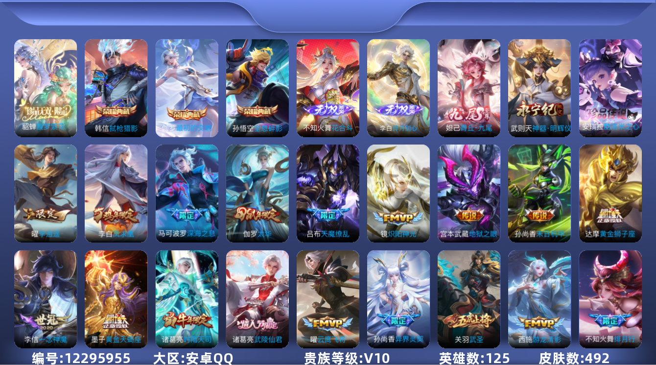 [12295955]V10 3典藏 1珍品无双 4无双 1珍品传说 46传说 125英雄 492皮肤 可修改实名 优质装备:馥梦繁花,全息碎影(猴子典藏),弑枪猎影(韩信典藏),神器·明辉仪,青丘·九尾(妲己无双),碎月剑心(李白无双),花合斗,最初的交响(伽罗典藏),酷洛米之心,黄金狮子座,黄金射手座,冠军飞将,云鹰飞将(小将军),绛天战甲(鸡嘴战神),黄金白羊座,猫影幻舞,久胜战神,炽阳神光,一念神魔,云霓雀翎,末日机甲-孙尚香(绿蚂蚱),地狱火,仲夏夜之梦(大飞蛾),音你心动-小乔,零号·赤焰,地狱之眼,音你心动-周瑜,李逍遥,乞巧织情,时之恋人-刘备(电焊工),游龙清影(小青龙),淬星耀世,超时空战士-狄仁杰,花朝如约(花篮子),音你闪耀(rap皮),神器·狴犴令,神器·明辉仪,青丘·九尾,电玩·雷克斯,艾琳觅芳踪,黄金天蝎座 传说皮:铠冥王哈迪斯,幻光神枪 珍宝阁皮:妄想食味,胡桃夹子,玩趣恶龙 限定皮:逐霄战戟,鸣野蒿,至尊宝,凤求凰(白切鸡),凤凰于飞,太华(伽罗年限),武陵仙君(小桃花),异界灵契(白毛香),星穹之声,绯月行,白鹤梁神女,魔法小厨娘,白晶晶,时雨天司(水龙头),神威(电光马子),飞衡(韩信年限),瑞麟志(木兰年限),高山流水,齐天大圣,匿光决锋者,五谷丰年,青龙志(铠年限),冰锋战神,武圣,天狼运算者,梁祝,御风骁将(吕布年限),岱宗(典韦年限),天狼溯光者,虎魄,天狼征服者,奔雷神使(牛魔年限),天狼绘梦者,李小龙,逐梦之影,玄武志(苏烈年限),朱雀志(守约年限),辉光之辰,如梦令-后羿,霸王别姬-项羽,霸王别姬-虞姬,奇迹圣诞,孙行者,猪悟能,大圣娶亲,引擎之心,天魔缭乱,乒乒小将,神奇女侠,无尽星芒,深海之息(深海大菠萝),唐三藏,时之奇旅-妲己,神器·万象笔,梦圆繁星 史诗皮:鸭鸭历险记-刘禅,化蝶舞,星界战将,灵蛊蚀心,龙之律动,小牛鸭,石田雨龙,茶境仙,破空之剑,东方月初,蒙犽顽岩魄,埋骨钱,芈月浮光幕影,怒海争锋,谪仙醉月,决胜骁骑,蔬乡物语(鲁班七号),琥珀纪元伽罗,百相守梦-百里守约,遇见神鹿,紫霞仙子,苍穹之光,电玩小子(小书包),白龙吟,黄金分割率,特工魅影,千年之狐,电玩·兔顽号,匿光破解者,百相守梦(刘备),百相守梦(关羽),电玩·爆裂旋风,浮梦罗烟,匿光侦查者,江河有灵,百解令(蒙犽),高渐离燃音魔法,银翎春语,偶像歌手
