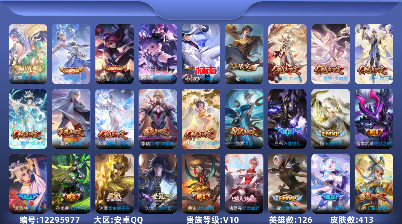 [12295977]V10 2典藏 1珍品无双 2珍品传说 46传说 126英雄 413皮肤 典藏英雄武则天 可修改实名 优质装备:馥梦繁花,杀手不太冷,最初的交响(伽罗典藏),怪盗基德,酷洛米之心,黄金狮子座,黄金射手座,冠军飞将,云鹰飞将(小将军),猫影幻舞,久胜战神,炽阳神光,一念神魔,云霓雀翎,末日机甲-孙尚香(绿蚂蚱),地狱火,仲夏夜之梦(大飞蛾),零号·赤焰,海洋之心,地狱之眼,李逍遥,乞巧织情,淬星耀世,超时空战士-狄仁杰,遇见胡旋,音你闪耀(rap皮),山海·炽霜斩(李信年限),山海·琳琅生(小乔年限),浮生妄,妄想实况,大乔-时之奇旅,艾琳觅芳踪,玄雷天君 传说皮:貂蝉曦玄引,典韦战鼓燎原,幻光神枪 珍宝阁皮:优雅恋人,玩趣恶龙 限定皮:愿照·九州拓(澜年限),愿照·福禄聚(蔡文姬年限),愿照·岁时盈(虞姬年限),愿照·山河定(司空震年限),愿照·众生和(妲己年限),愿照·千秋盛(女娲年限),陌上桑,鸣野蒿,至尊宝,凤求凰(白切鸡),太华(伽罗年限),武陵仙君(小桃花),魔法小厨娘,飞衡(韩信年限),遇见飞天,高山流水,诗剑行,齐天大圣,怒海麟威,五谷丰年,冰锋战神,天狼运算者,游园惊梦,梁祝,逐梦之星,天狼溯光者,天狼征服者,李小龙,辉光之辰,孙行者,大圣娶亲,天魔缭乱,热情桑巴,美猴王 史诗皮:鸭鸭历险记-刘禅,器灵·浮梦炉,狼魂孤将,化蝶舞,灵蛊蚀心,星界战将,龙之律动,石田雨龙,茶境仙,破空之剑,上官婉儿群星魔术团,蔬乡物语(鲁班七号),乘龙·聚宝船(安琪拉年限),百相守梦-百里守约,星界特工,百相守梦-黄忠,织梦人,遇见神鹿,紫霞仙子,苍穹之光,电玩小子(小书包),白龙吟,黄金分割率,特工魅影,千年之狐,永昼,浮梦罗烟,魅语,高渐离燃音魔法,无限星赏官,青蛇,偶像歌手,晚萤,暗夜猫娘,龙骑士(小龙虾),末日机甲-吕布,猫狗日记-孙策,猫狗日记-大乔,时之恋人-孙尚香,乱世虎臣,节奏热浪,修罗,女仆咖啡,摇滚巨星,水果甜心,绅士熊喵,天才门将,星夜王子,心灵骇客,功夫厨神,德古拉伯爵,暗隐猎兽者,幽灵船长,鬼剑武藏,暗渊魔法,心灵战警,乐园奇幻夜,天秀·启明,舞动绿茵,地狱岩魂,诗语江南,纤云弄巧,繁星吟游(呼啦呼啦),缤纷独角兽,乘风破浪,逐浪之夏,水晶猎龙者,曙光守护者,热力回旋,箭羽风息,唤灵魅影,金属风暴,原初追逐者,圣诞狂欢,圣诞恋歌,鹰眼统帅,