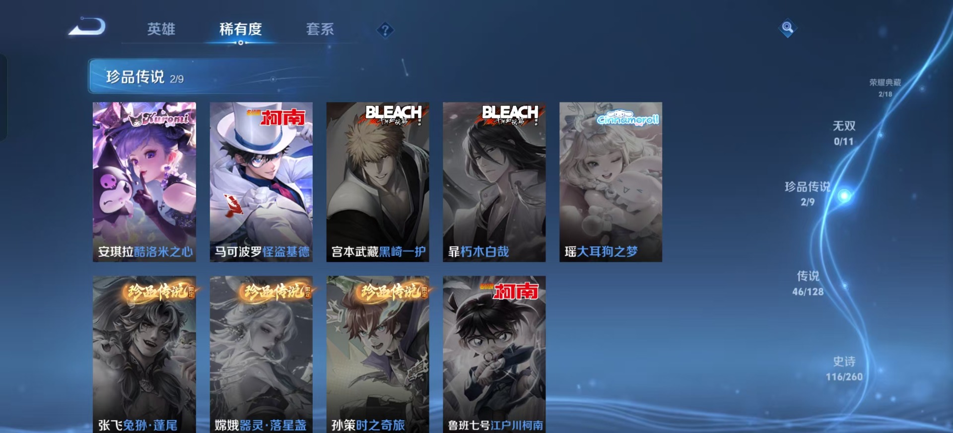 - PX_2097236-47 安卓QQ/永恒钻石/178皮肤/125英雄/0典藏/0珍品无双/1无双/2珍品传说/10传说/34史诗/9稀有英雄 【2 珍品传说】怪盗基德 马可波罗,江户川柯南 鲁班七号, 【1 无双皮肤】离恨烟 公孙离, 【10 传说皮肤】零号·赤焰 孙悟空,云鹰飞将 曜,诗剑行 李白,祈雪灵祝 公孙离,启示之音 露娜,时之恋人 刘备,炽翼辉光 伽罗,冠军飞将 花木兰,愿照·九州拓