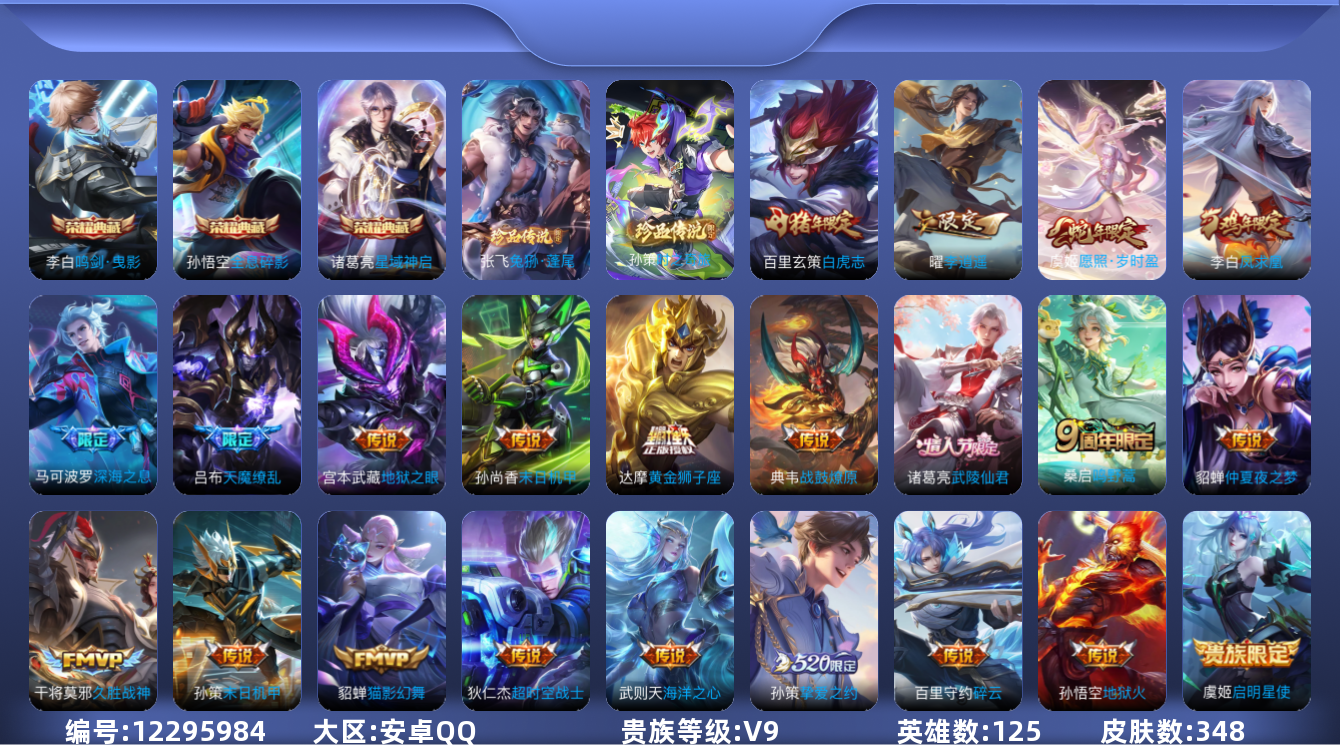 [12295984]V9 3典藏 2珍品传说 23传说 125英雄 348皮肤 典藏英雄武则天 可修改实名 优质装备:鸣剑·曳影,全息碎影(猴子典藏),星域神启(倪克斯贼亮),黄金狮子座,黄金白羊座,猫影幻舞,久胜战神,末日机甲-孙尚香(绿蚂蚱),地狱火,仲夏夜之梦(大飞蛾),海洋之心,地狱之眼,李逍遥,超时空战士-狄仁杰,末日机甲-孙策,挚爱之约,碎云,涂山容容 珍品传说:时之奇旅-孙策,兔狲·蓬尾 传说皮:典韦战鼓燎原 珍宝阁皮:妄想食味,优雅恋人,蔷薇恋人 限定皮:愿照·岁时盈(虞姬年限),鸣野蒿,至尊宝,白虎志(电光耗子),凤求凰(白切鸡),武陵仙君(小桃花),傲雪梅枪,魔法小厨娘,飞衡(韩信年限),遇见飞天,高山流水,降魔,五谷丰年,冰锋战神,梁祝,天狼征服者,李小龙,逐梦之影,朱雀志(守约年限),辉光之辰,如梦令-后羿,圣诞老人,真爱至上,猪悟能,大圣娶亲,引擎之心,天魔缭乱,蜜橘之夏,深海之息(深海大菠萝),神器·万象笔 史诗皮:鸭鸭历险记-刘禅,器灵·浮梦炉,化蝶舞,星界战将,龙之律动,小牛鸭,石田雨龙,茶境仙,破空之剑,遇见神鹿,紫霞仙子,电玩小子(小书包),黄金分割率,特工魅影,千年之狐,永昼,江河有灵,魅语,百解令(蒙犽),蒙恬荣光圣徽,无限星赏官,青蛇,偶像歌手,白蛇,晚萤,暗夜猫娘,银翎春语,龙骑士(小龙虾),末日机甲-吕布,猫狗日记-孙策,猫狗日记-大乔,乱世虎臣,节奏热浪,修罗,女仆咖啡,摇滚巨星,水果甜心,绅士熊喵,天才门将,星夜王子,心灵骇客,功夫厨神,德古拉伯爵,暗隐猎兽者,幽灵船长,鬼剑武藏,暗渊魔法,心灵战警,乐园奇幻夜,天秀·启明,舞动绿茵,地狱岩魂,诗语江南,纤云弄巧,繁星吟游(呼啦呼啦),拒霜思,缤纷独角兽,乘风破浪,逐浪之夏,水晶猎龙者,曙光守护者,箭羽风息,金属风暴,原初追逐者,圣诞狂欢,圣诞恋歌,鹰眼统帅,魅力维加斯,黎明之约,未来纪元-赵云