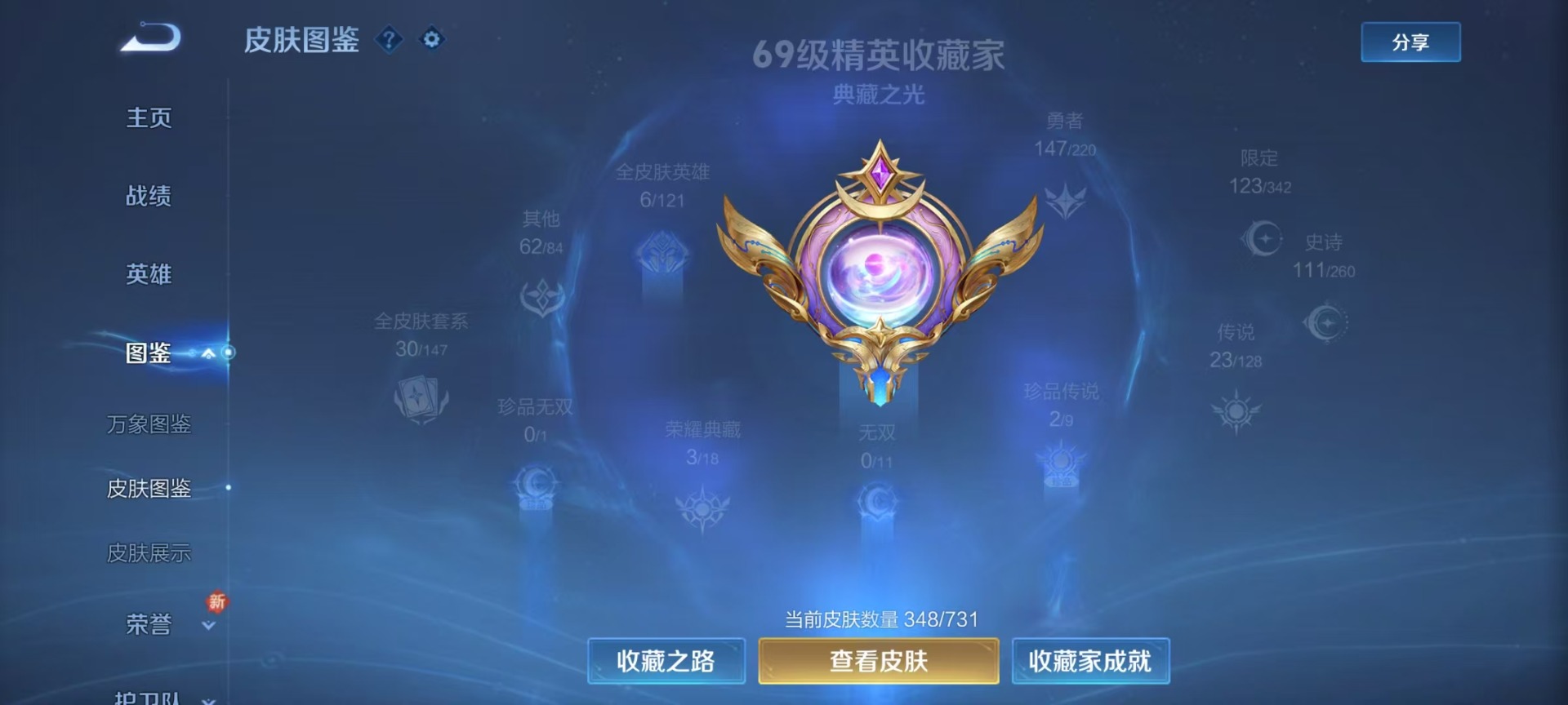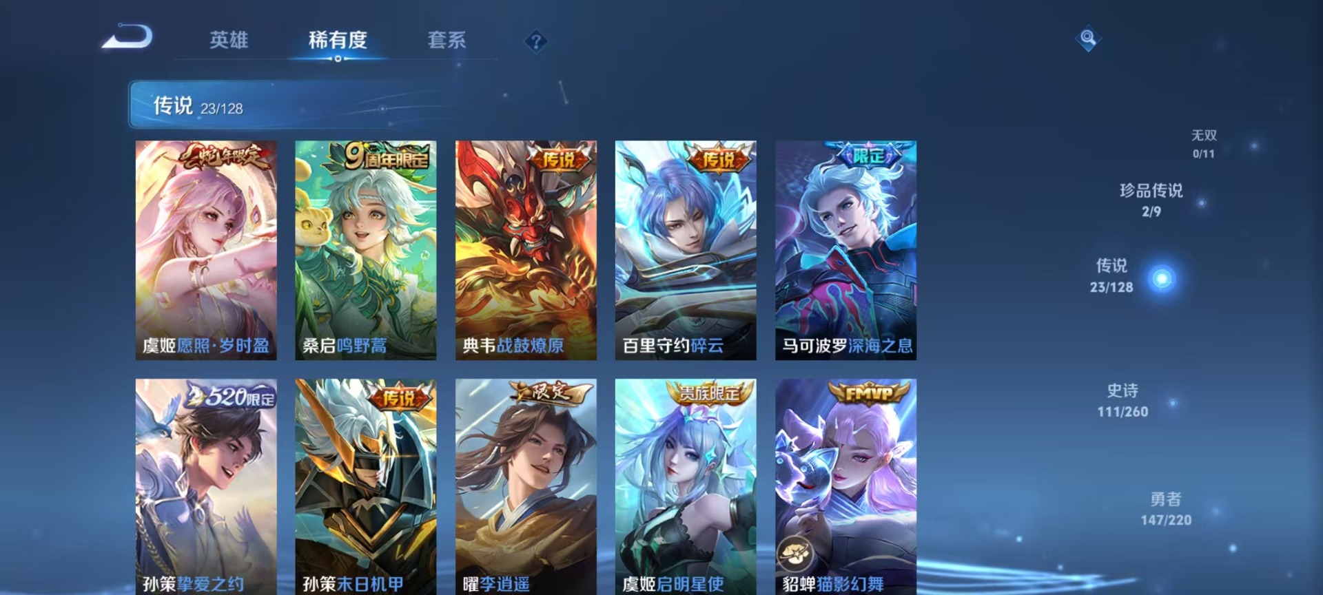 - PX_2096132-15 安卓QQ/无双王者/341皮肤/124英雄/1典藏/0珍品无双/0无双/4珍品传说/33传说/83史诗/8稀有英雄 【4 珍品传说】黑崎一护 宫本武藏,怪盗基德 马可波罗,时之奇旅 孙策,兔狲·蓬尾 张飞, 【1 典藏皮肤】银白咏叹调 铠, 【33 传说皮肤】启明星使 虞姬,逐花归海 澜,云鹰飞将 曜,齐天大圣 孙悟空,浮生妄 夏洛特,落雪白狼 亚连,惊梅引 宫本武藏,