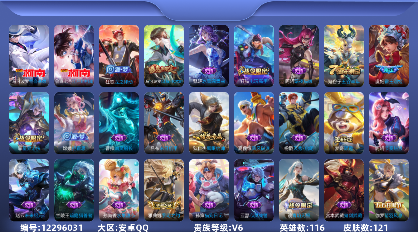 [12296031]V6 2珍品传说 116英雄 121皮肤 可修改实名 优质装备:江户川柯南,怪盗基德 限定皮:逐霄战戟,五谷丰年,霸王别姬-虞姬,山海·玄木吟(马可年限) 史诗皮:龙之律动,暗夜猫娘,末日机甲-吕布,猫狗日记-孙策,节奏热浪,摇滚巨星,水果甜心,暗隐猎兽者,幽灵船长,鬼剑武藏,心灵战警,天秀·启明,拒霜思,乘风破浪,逐浪之夏,箭羽风息,鹰眼统帅,魅力维加斯,黎明之约,未来纪元-赵云