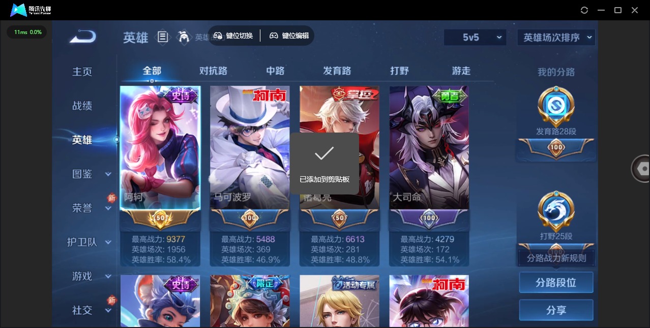 - [11680756]V6 2传说 100英雄 114皮肤 可修改实名 优质装备:绛天战甲(鸡嘴战神) 限定皮:逐霄战戟,影龙天霄 史诗皮:鸭鸭历险记-刘禅,化蝶舞,雪豹·霜爪,石田雨龙,紫霞仙子,苍穹之光,电玩小子(小书包),匿光侦查者,乱世虎臣,水果甜心,暗隐猎兽者,鬼剑武藏,心灵战警,拒霜思,水晶猎龙者,圣诞狂欢,鹰眼统帅,魅力维加斯,赏金猎手