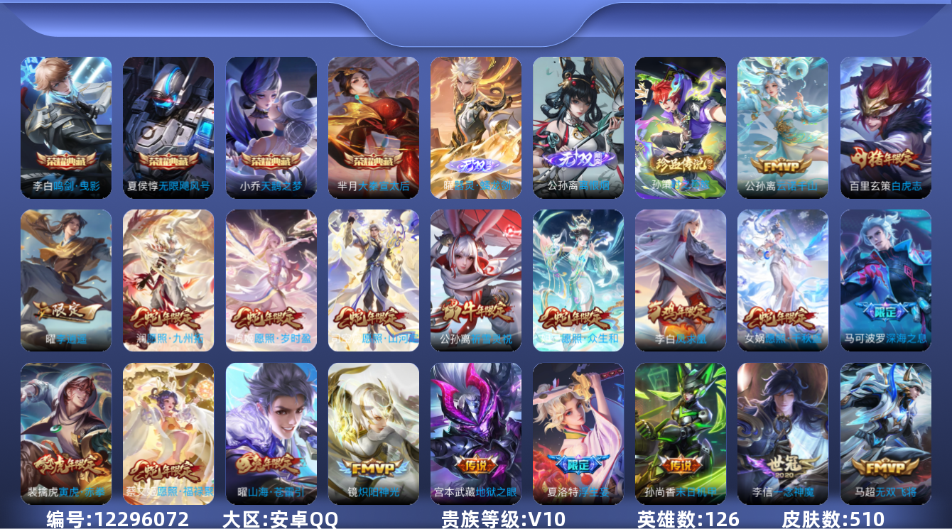 [12296072]V10 4典藏 2无双 1珍品传说 43传说 126英雄 510皮肤 典藏英雄武则天 可修改实名 优质装备:天鹅之梦(小乔典藏),无限飓风号(高达),大秦宣太后,鸣剑·曳影,离恨烟(公孙离无双),器灵·螭龙剑,云鹰飞将(小将军),炽阳神光,一念神魔,末日机甲-孙尚香(绿蚂蚱),海洋之心,地狱之眼,李逍遥,时之恋人-刘备(电焊工),游龙清影(小青龙),淬星耀世,超时空战士-狄仁杰,无双飞将,山海·苍雷引(电光曜子),浮生妄,记忆之芯(机甲兔),妄想实况,妄想奇谈,艾琳觅芳踪,千劫归真,涂山容容 珍品传说:时之奇旅-孙策 传说皮:乘龙·铭钟鼎(赵云年限),典韦战鼓燎原,云诺千山,铠冥王哈迪斯,星之鸣奏,幻光神枪 珍宝阁皮:万物之道,优雅恋人,蔷薇恋人,女武神 限定皮:愿照·九州拓(澜年限),愿照·福禄聚(蔡文姬年限),愿照·岁时盈(虞姬年限),愿照·山河定(司空震年限),愿照·众生和(妲己年限),愿照·千秋盛(女娲年限),逐霄战戟,陌上桑,鸣野蒿,至尊宝,白虎志(电光耗子),凤求凰(白切鸡),异界灵契(白毛香),傲雪梅枪,寅虎·展翼(孙膑年限),魔法小厨娘,神威(电光马子),高山流水,诗剑行,齐天大圣,匿光决锋者,五谷丰年,青龙志(铠年限),冰锋战神,武圣,天狼运算者,游园惊梦,梁祝,龙胆,逐梦之星,烈魂,岱宗(典韦年限),天狼溯光者,虎魄,祈雪灵祝(雪兔子),天狼绘梦者,李小龙,玄武志(苏烈年限),朱雀志(守约年限),如梦令-后羿,霸王别姬-项羽,奇迹圣诞,默契交锋-花木兰,真爱至上,孙行者,猪悟能,一生所爱,引擎之心,冰霜恋舞曲,蜜橘之夏,匿光追影者,寅虎·御盾(廉颇年限),寅虎·瑞焰(虎皮蛋子),寅虎·心曲(虎婆),寅虎·赤拳(老虎年限),时之祈愿-云中君,百木心枪,玉兔公主,深海之息(深海大菠萝),天降福星,山海·玄木吟(马可年限),冰霜神祇 史诗皮:鸭鸭历险记-刘禅,器灵·浮梦炉,糖绘人间,狼魂孤将,绮世丹青,瑰影绮梦,化蝶舞,灵蛊蚀心,星界战将,谪仙醉月,龙之律动,石田雨龙,百相守梦-周瑜,戍鼓铭心,茶境仙,怒海争锋,破空之剑,夜落电台,蔬乡物语(鲁班七号),乘龙·聚宝船(安琪拉年限),百相守梦-百里守约,星界特工,百相守梦-黄忠,织梦人,遇见神鹿,紫霞仙子,苍穹之光,电玩小子(小书包),黄金分割率,特工魅影,千年之狐,永昼,江河有灵,匿光侦查者,魅语,