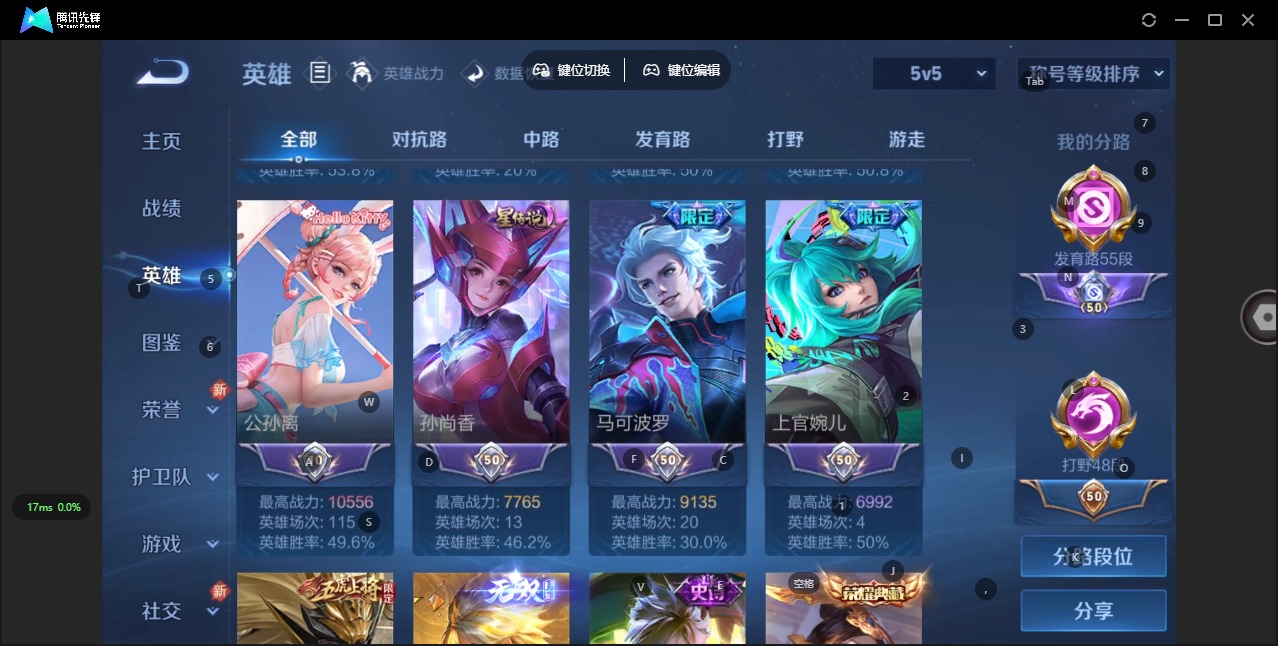 - [11284449]V5 4传说 105英雄 93皮肤 可修改实名 优质装备:超时空战士-狄仁杰 传说皮:幻光神枪 珍宝阁皮:万物之道 限定皮:愿照·九州拓(澜年限),逐霄战戟,鸣野蒿 史诗皮:器灵·浮梦炉,星界战将,龙之律动,破空之剑,谪仙醉月,炽弈燎原,江河有灵,蒙恬荣光圣徽,暗夜猫娘,末日机甲-吕布,猫狗日记-孙策,乱世虎臣,水果甜心,鬼剑武藏,暗渊魔法,舞动绿茵,缤纷独角兽,乘风破浪,逐浪之夏,水晶猎龙者,曙光守护者,金属风暴,鹰眼统帅,魅力维加斯,滕王阁序