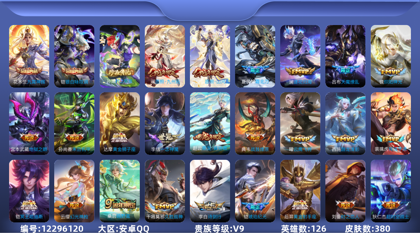 [12296120]V9 2典藏 1珍品传说 28传说 126英雄 380皮肤 可修改实名 优质装备:九霄神辉(木兰典藏),银白咏叹调(倪克斯侍卫),黄金狮子座,黄金射手座,云鹰飞将(小将军),绛天战甲(鸡嘴战神),久胜战神,炽阳神光,一念神魔,末日机甲-孙尚香(绿蚂蚱),地狱之眼,乞巧织情,时之恋人-刘备(电焊工),游龙清影(小青龙),超时空战士-狄仁杰,碎云,澜逐花归海,琥珀纪元铠,涂山容容 珍品传说:时之奇旅-孙策 传说皮:乘龙·铭钟鼎(赵云年限),典韦战鼓燎原,铠冥王哈迪斯,幻光神枪,祥瑞亨通 珍宝阁皮:胡桃夹子,蔷薇恋人 限定皮:愿照·九州拓(澜年限),愿照·山河定(司空震年限),逐霄战戟,鸣野蒿,夏侯惇霜北刀,至尊宝,凤凰于飞,神威(电光马子),飞衡(韩信年限),高山流水,诗剑行,降魔,五谷丰年,冰锋战神,游园惊梦,梁祝,岱宗(典韦年限),虎魄,天狼征服者,李小龙,孙行者,猪悟能,大圣娶亲,天魔缭乱,冰霜恋舞曲 史诗皮:苍鳞隐世,器灵·浮梦炉,绮世丹青,化蝶舞,鸭鸭历险记-刘禅,雪豹·霜爪,龙之律动,琥珀纪元伽罗,藏狐·褐绒,茶境仙,百相守梦-百里守约,谪仙醉月,星界特工,破空之剑,埋骨钱,芈月浮光幕影,怒海争锋,决胜骁骑,蔬乡物语(鲁班七号),百相守梦-黄忠,星界战将,紫霞仙子,苍穹之光,电玩小子(小书包),黄金分割率,特工魅影,千年之狐,永昼,白蛇,江河有灵,百解令(蒙犽),高渐离燃音魔法,蒙恬荣光圣徽,魅语,冰冠公主,青蛇,偶像歌手,末日机甲-吕布,猫狗日记-孙策,猫狗日记-大乔,时之恋人-孙尚香,乱世虎臣,节奏热浪,修罗,女仆咖啡,摇滚巨星,水果甜心,绅士熊喵,天才门将,星夜王子,心灵骇客,功夫厨神,德古拉伯爵,暗隐猎兽者,幽灵船长,鬼剑武藏,心灵战警,天秀·启明,舞动绿茵,地狱岩魂,诗语江南,纤云弄巧,缤纷独角兽,乘风破浪,逐浪之夏,水晶猎龙者,曙光守护者,箭羽风息,金属风暴,圣诞狂欢,圣诞恋歌,鹰眼统帅,暗夜贵公子,魅力维加斯,黎明之约,赏金猎手,未来纪元-赵云