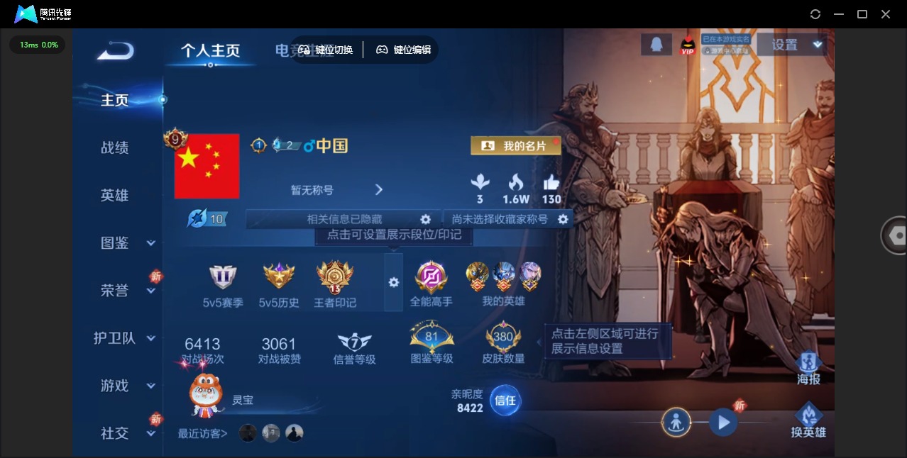 - [11714224]V8 1典藏 1无双 1珍品传说 23传说 125英雄 355皮肤 可修改实名 优质装备:全息碎影(猴子典藏),器灵·螭龙剑,怪盗基德,云鹰飞将(小将军),绛天战甲(鸡嘴战神),炽阳神光,一念神魔,地狱火,仲夏夜之梦(大飞蛾),零号·赤焰,地狱之眼,时之恋人-刘备(电焊工),挚爱之约,无双飞将,山海·苍雷引(电光曜子),燃星之曲,澜逐花归海 传说皮:乘龙·淬吴钩(孙策年限),祥瑞亨通,幻光神枪 珍宝阁皮:优雅恋人,蔷薇恋人,玩趣恶龙 限定皮:愿照·岁时盈(虞姬年限),愿照·千秋盛(女娲年限),逐霄战戟,鸣野蒿,至尊宝,傲雪梅枪,白晶晶,神威(电光马子),遇见飞天,高山流水,诗剑行,齐天大圣,五谷丰年,梁祝,烈魂,天狼征服者,李小龙,如梦令-后羿,孙行者,猪悟能,冰霜恋舞曲,美猴王 史诗皮:鸭鸭历险记-刘禅,化蝶舞,灵蛊蚀心,星界战将,龙之律动,茶境仙,怒海争锋,蒙犽顽岩魄,超元猎域,百相守梦-百里守约,百相守梦-黄忠,紫霞仙子,电玩小子(小书包),黄金分割率,特工魅影,千年之狐,江河有灵,雪夜绮愿(周瑜),真我赫兹(百里守约),百解令(蒙犽),高渐离燃音魔法,蒙恬荣光圣徽,无限星赏官,偶像歌手,电玩·爆裂旋风,暗夜猫娘,末日机甲-吕布,猫狗日记-孙策,猫狗日记-大乔,时之恋人-孙尚香,乱世虎臣,节奏热浪,修罗,女仆咖啡,摇滚巨星,水果甜心,绅士熊喵,天才门将,星夜王子,心灵骇客,功夫厨神,德古拉伯爵,暗隐猎兽者,幽灵船长,鬼剑武藏,心灵战警,舞动绿茵,地狱岩魂,纤云弄巧,繁星吟游(呼啦呼啦),拒霜思,缤纷独角兽,乘风破浪,逐浪之夏,月团寄思,水晶猎龙者,曙光守护者,箭羽风息,金属风暴,原初追逐者,圣诞狂欢,圣诞恋歌,鹰眼统帅,王者之锤,暗夜贵公子,魅力维加斯,黎明之约,无心,未来纪元-赵云