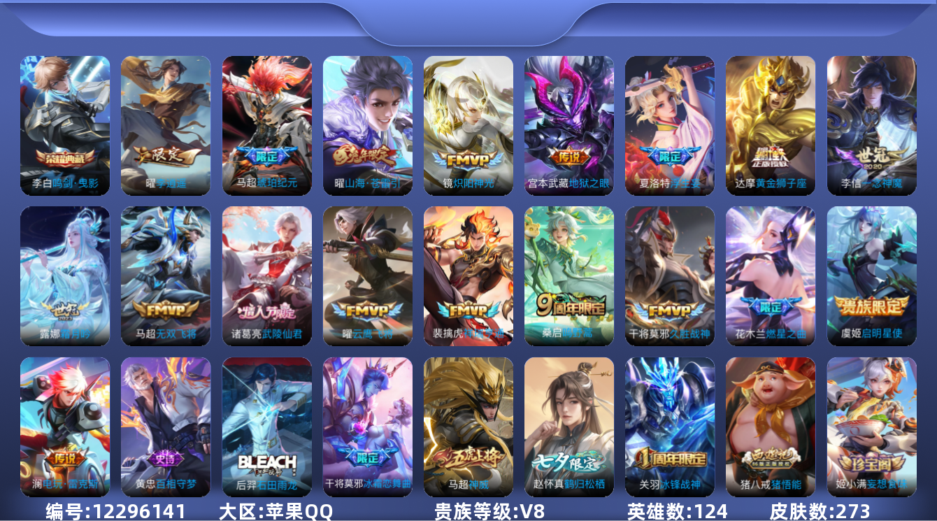 [12296141]V8 1典藏 18传说 124英雄 273皮肤 可修改实名 优质装备:鸣剑·曳影,黄金狮子座,云鹰飞将(小将军),久胜战神,炽阳神光,一念神魔,地狱之眼,李逍遥,无双飞将,山海·苍雷引(电光曜子),燃星之曲,浮生妄,电玩·雷克斯,霜月吟,琥珀纪元马超 传说皮:祥瑞亨通 珍宝阁皮:妄想食味,蔷薇恋人,玩趣恶龙 限定皮:鸣野蒿,武陵仙君(小桃花),神威(电光马子),飞衡(韩信年限),高山流水,五谷丰年,冰锋战神,梁祝,李小龙,猪悟能,一生所爱,冰霜恋舞曲,匿光追影者 史诗皮:星界战将,石田雨龙,茶境仙,怒海争锋,破空之剑,上官婉儿群星魔术团,百相守梦-百里守约,星界特工,百相守梦-黄忠,紫霞仙子,苍穹之光,电玩小子(小书包),特工魅影,千年之狐,鹤归松栖(赵怀真),真我赫兹(镜),魅语,蒙恬荣光圣徽,偶像歌手,晚萤,电玩·爆裂旋风,龙骑士(小龙虾),猫狗日记-孙策,猫狗日记-大乔,乱世虎臣,节奏热浪,修罗,女仆咖啡,摇滚巨星,水果甜心,天才门将,星夜王子,心灵骇客,德古拉伯爵,暗隐猎兽者,幽灵船长,鬼剑武藏,心灵战警,天秀·启明,地狱岩魂,纤云弄巧,繁星吟游(呼啦呼啦),拒霜思,逐浪之夏,月团寄思,水晶猎龙者,曙光守护者,金属风暴,原初追逐者,圣诞狂欢,圣诞恋歌,鹰眼统帅,黎明之约,未来纪元-赵云,玫瑰异探