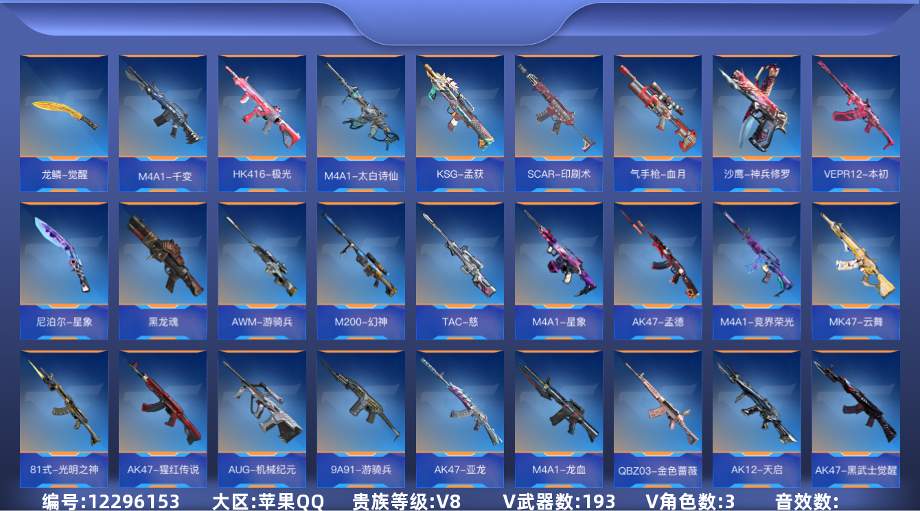 [12296153]V8 可二次 可修改实名 V8 4王者武器 193英雄武器 3英雄角色 379万化 枪王SS 英雄武器:M200-幻神,AK47-孟德,VEPR12-本初,M4A1-星象,TAC-慈,81式-光明之神,MK47-云舞,KSG-孟获,加特林-炼狱,COP 357-星象,COP 357-堕天神,COP 357-雷霆,巴雷特-金色蔷薇,巴雷特-极光,巴雷特-毁灭,AK47-黑武士觉醒,AK47-火麒麟,AK47-无影,M4A1-竞界荣光,M4A1-雷神,M4A1-黑龙,M4A1-黑骑士,AWM-天使,98K-黑骑士,QBZ03-金色蔷薇,AWM-游骑兵,9A91-游骑兵,AUG-机械纪元,MK5-极光,KSG-黑骑士,AK47-亚龙,AK47-猩红传说,M4A1-龙血,M4A1-猎神,M4A1-千变,M200-心动次元觉醒,09式狙-天神,AWM-裁决,98K-血月,AK12-天启,AWM-天龙,剑齿虎,SCAR-探星者,MK47-鼓龙,黑龙魂,A180-地狱凤凰,PP19野牛-造纸术,嗜血金鲨,地狱烈炎,CZS2-血月,打击者-天神,KSG-火力竞放觉醒,KSG-极光,毁灭征服者-超越Max,SCAR-印刷术,HK416-极光,M4A1-太白诗仙,尼泊尔-星象,双持柯尔特-极光,沙鹰-无影,沙鹰-幻兽,气手枪-血月,沙鹰-神兵修罗,马来剑-毁灭,斩魔剑-天使,手斧-机械迷城,战斧-无影,柯尔特-伏刹山海觉醒,沙鹰-天神,麒麟刺,龙鳞-觉醒,弑魔者,神罚战斧,丛林匕首-庆龙觉醒,屠龙,龙啸