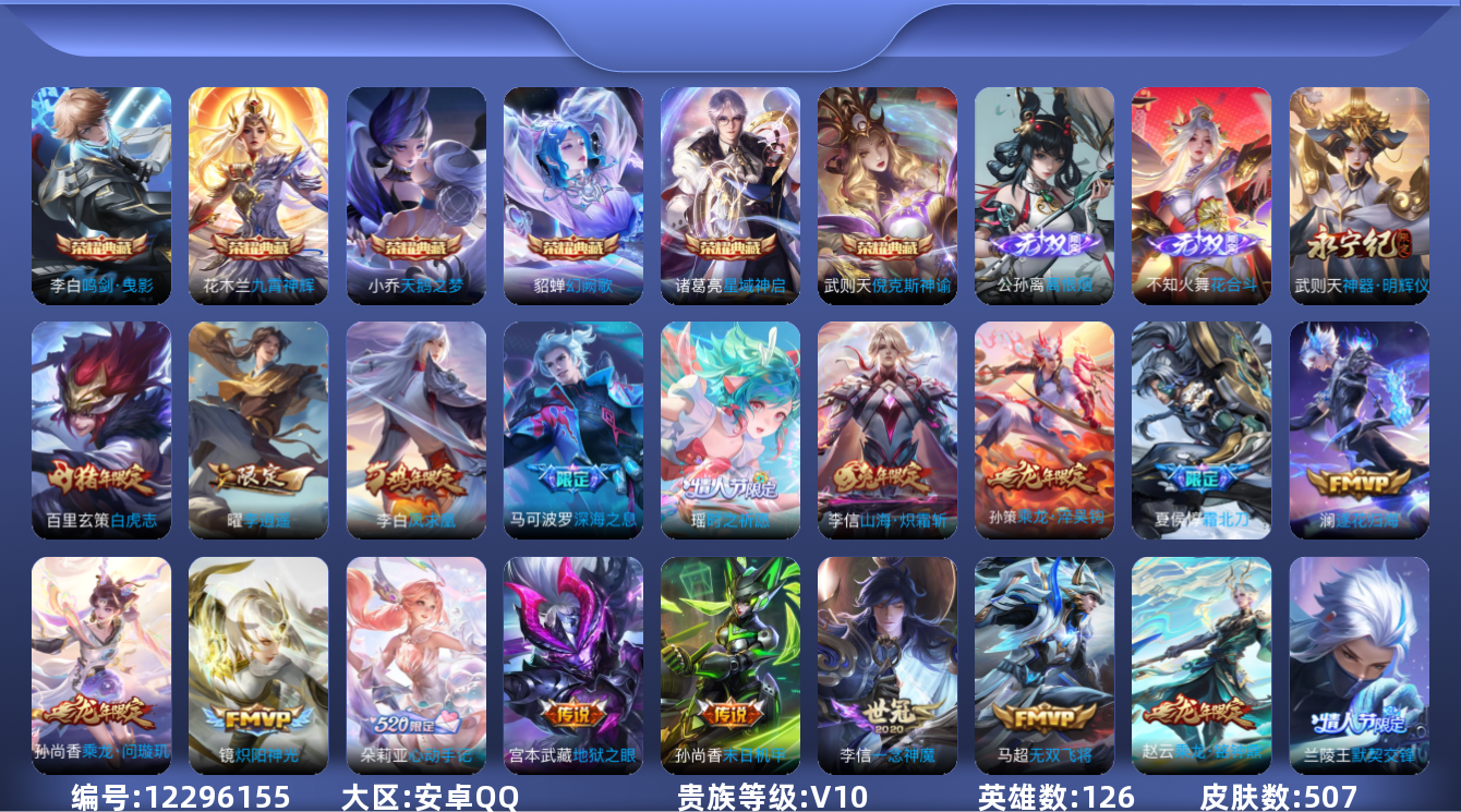 [12296155]V10 6典藏 3无双 54传说 126英雄 507皮肤 典藏英雄武则天 可修改实名 优质装备:天鹅之梦(小乔典藏),倪克斯神谕(宇宙婆娘),鸣剑·曳影,星域神启(倪克斯贼亮),九霄神辉(木兰典藏),幻阙歌(貂蝉典藏),神器·明辉仪,花合斗,离恨烟(公孙离无双),黄金射手座,冠军飞将,云鹰飞将(小将军),绛天战甲(鸡嘴战神),黄金白羊座,猫影幻舞,久胜战神,炽阳神光,一念神魔,云霓雀翎,末日机甲-孙尚香(绿蚂蚱),地狱火,仲夏夜之梦(大飞蛾),音你心动-小乔,海洋之心,地狱之眼,飞鸢探春,音你心动-周瑜,李逍遥,乞巧织情,时之恋人-刘备(电焊工),游龙清影(小青龙),淬星耀世,末日机甲-孙策,花朝如约(花篮子),无双飞将,音你闪耀(rap皮),神器·明辉仪,山海·炽霜斩(李信年限),炽翼辉光(娃娃菜牛角包),画中仙,电玩·雷克斯,澜逐花归海,艾琳觅芳踪,金乌负日,朵莉亚心动手记 传说皮:乘龙·问璇玑(孙尚香年限),乘龙·铭钟鼎(赵云年限),乘龙·淬吴钩(孙策年限),吕布曦玄引,铠冥王哈迪斯,幻光神枪 珍宝阁皮:妄想食味,优雅恋人,女武神 限定皮:鸣野蒿,夏侯惇霜北刀,至尊宝,白虎志(电光耗子),凤求凰(白切鸡),凤凰于飞,异界灵契(白毛香),傲雪梅枪,前尘镜,星穹之声,白鹤梁神女,魔法小厨娘,白晶晶,神威(电光马子),飞衡(韩信年限),山海·碧波行(瑶年限),瑞麟志(木兰年限),至美·乘鲤谣,遇见飞天,高山流水,诗剑行,五谷丰年,冰锋战神,幽恒(沐浴露),天狼运算者,游园惊梦,梁祝,天狼狩猎者,龙胆,逐梦之星,岱宗(典韦年限),天狼溯光者,虎魄,李小龙,朱雀志(守约年限),辉光之辰,如梦令-嫦娥,如梦令-后羿,霸王别姬-项羽,霸王别姬-虞姬,奇迹圣诞,默契交锋-兰陵王,默契交锋-花木兰,纯白花嫁,孙行者,猪悟能,大圣娶亲,青春决赛季,冰霜恋舞曲,乒乒小将,蜜橘之夏,神奇女侠,匿光追影者,时之祈愿-云中君,时之祈愿-瑶(瑶传限),百木心枪,玉兔公主,启示之音,深海之息(深海大菠萝),匿光启智者,时之奇旅-妲己,神器·万象笔,梦圆繁星,山海·玄木吟(马可年限) 史诗皮:灵蛊蚀心,星界战将,龙之律动,石田雨龙,怒海争锋,破空之剑,涂山红红,东方月初,蒙犽顽岩魄,埋骨钱,芈月浮光幕影,海诺心动手记,琥珀纪元伽罗,奇遇星旅,蔬乡物语(鲁班七号),超元猎域,乘龙·聚宝船(安